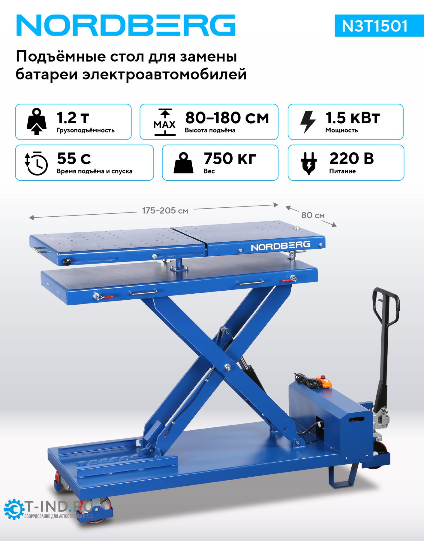 NORDBERG N3T1501 — электогидравлический подъёмный стол для АКБ электромобилей, грузоподъёмностью 1200 кг. Предназначен для безопасного перемещения и удержания габаритных узлов электромобилей при выполнении монтажных и демонтажных работ, обслуживания и замены. Обеспечивает точное позиционирование, снижает физические нагрузки на персонал и значительно ускоряет процесс ремонта.