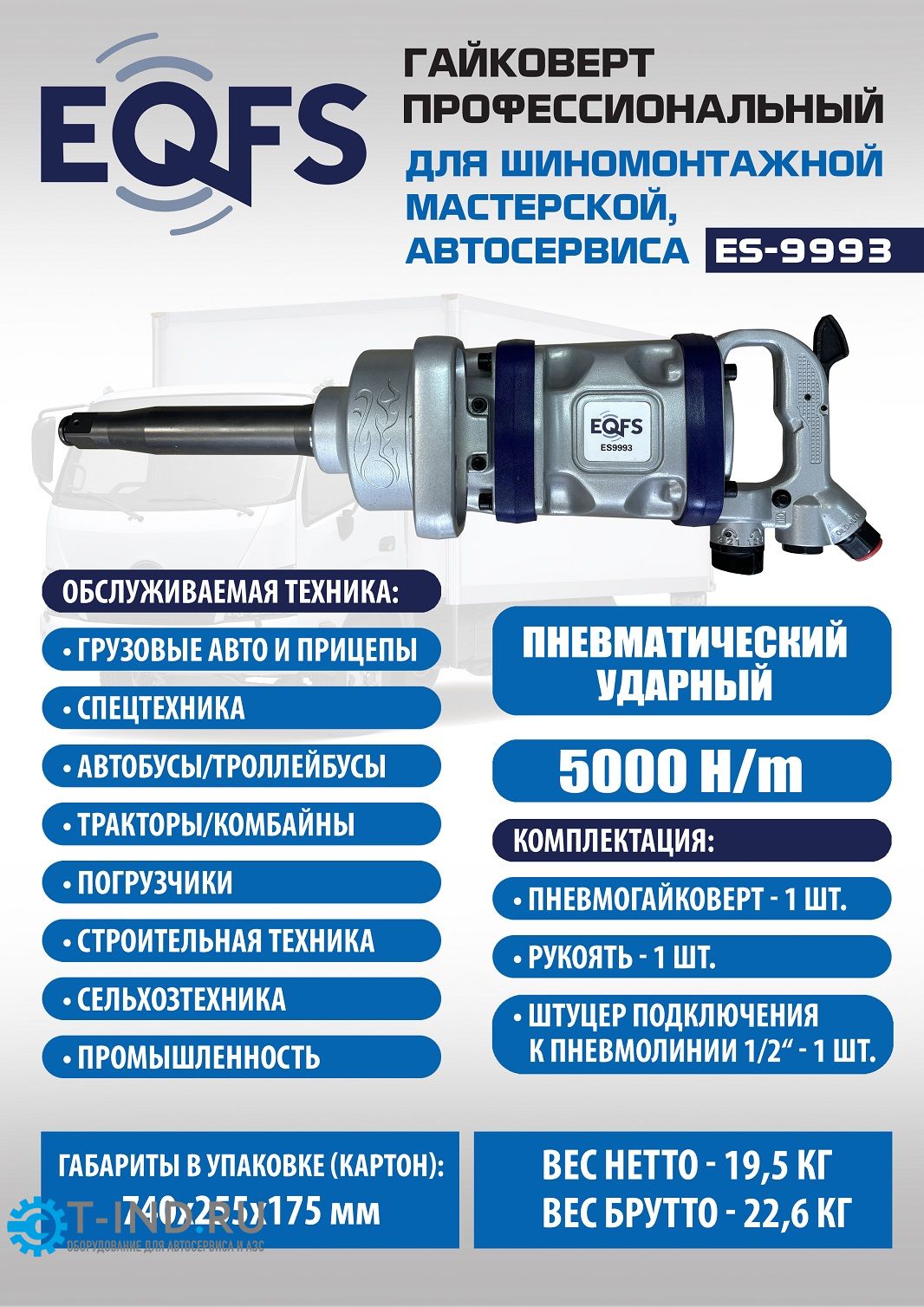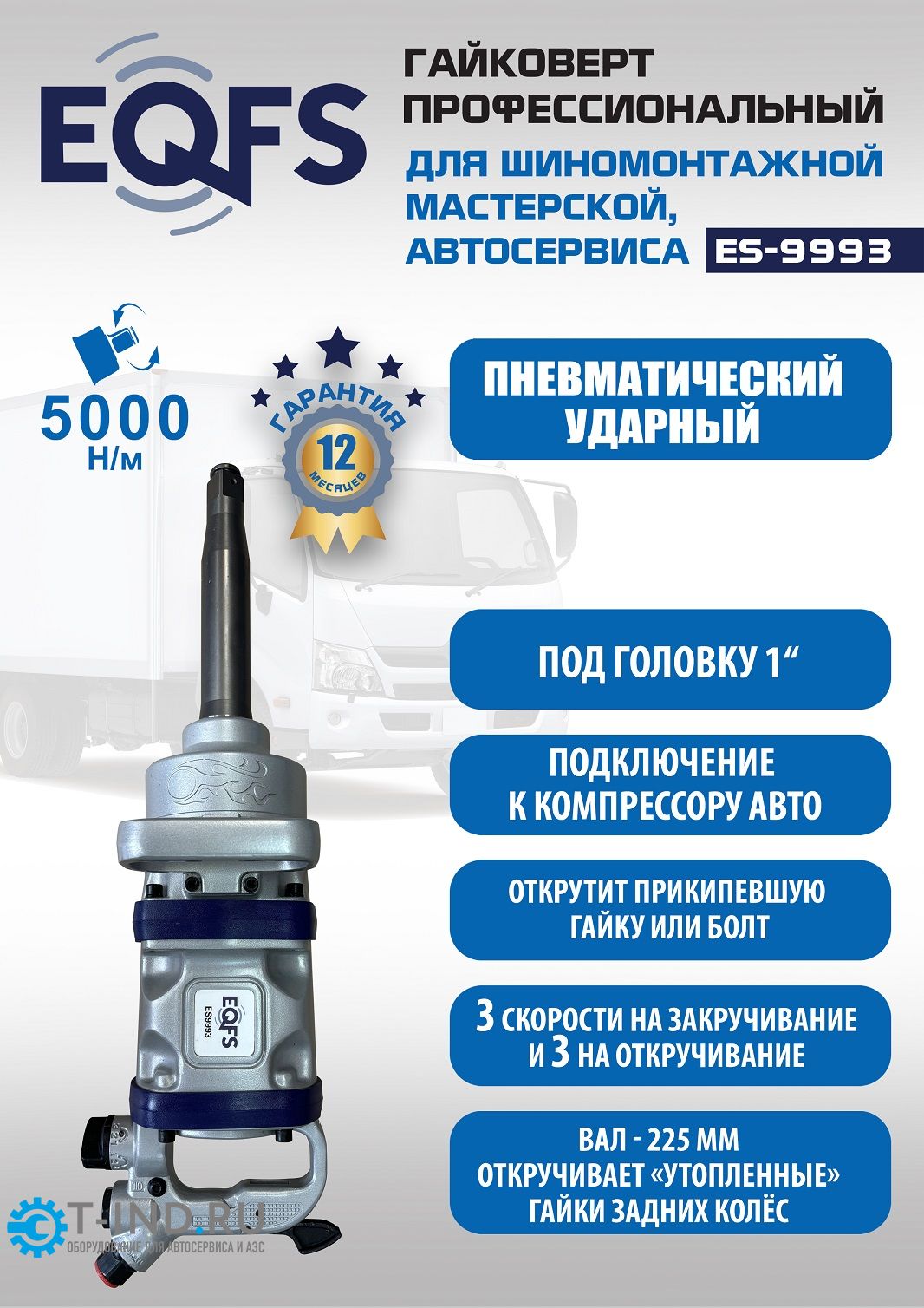 Пневмогайковерт ударный EQFS ES9993, 1", грузовой, 5000 Нм