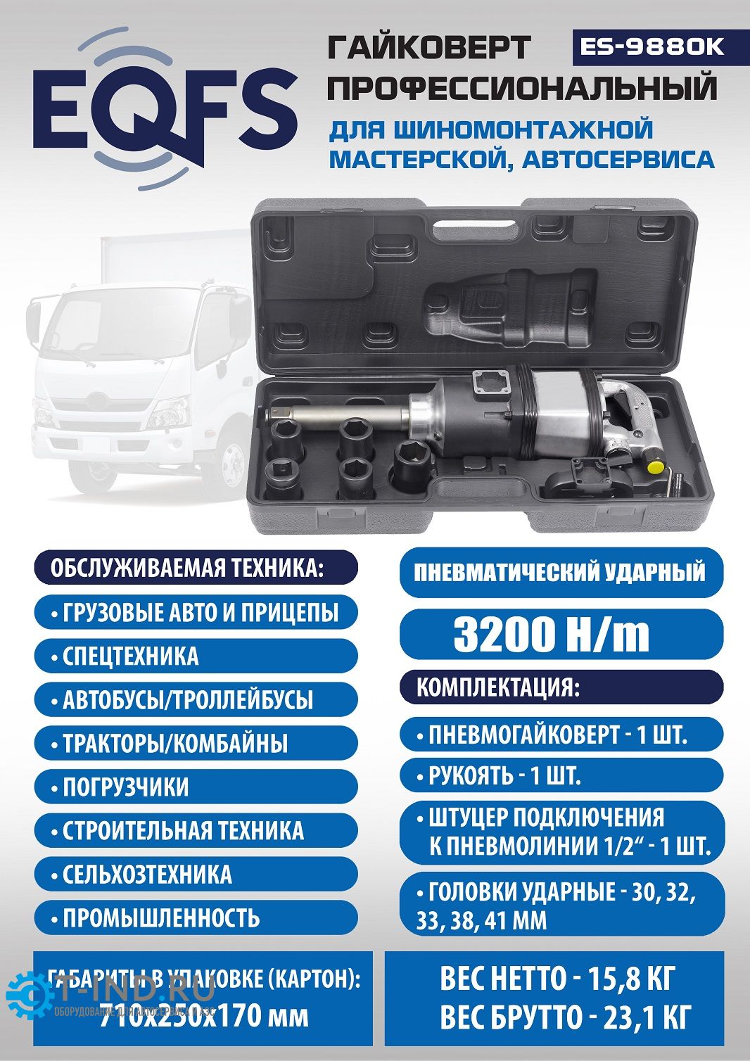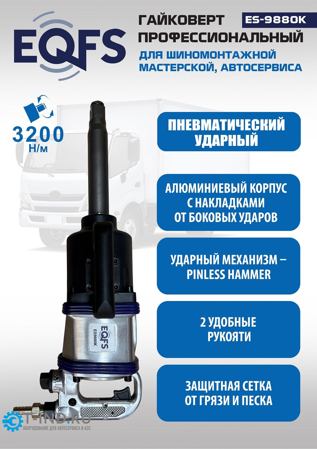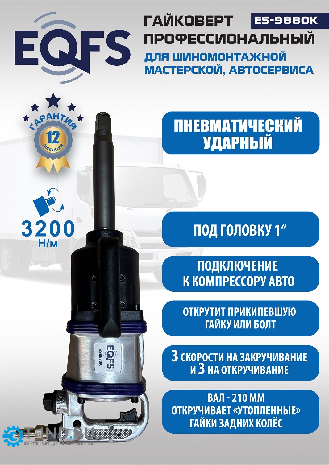 Пневмогайковерт ударный 1" EQFS ES9880К с набором головок в кейсе. Крутящий момент 3200Нм. Профессиональный. Длинный вал из легированной стали.Корпус металлический с двумя рукоятями. Реверс, регулировка скорости, регулировка крутящего момента. Для грузовых автомобилей, автобусов и производственных предприятий.
