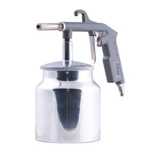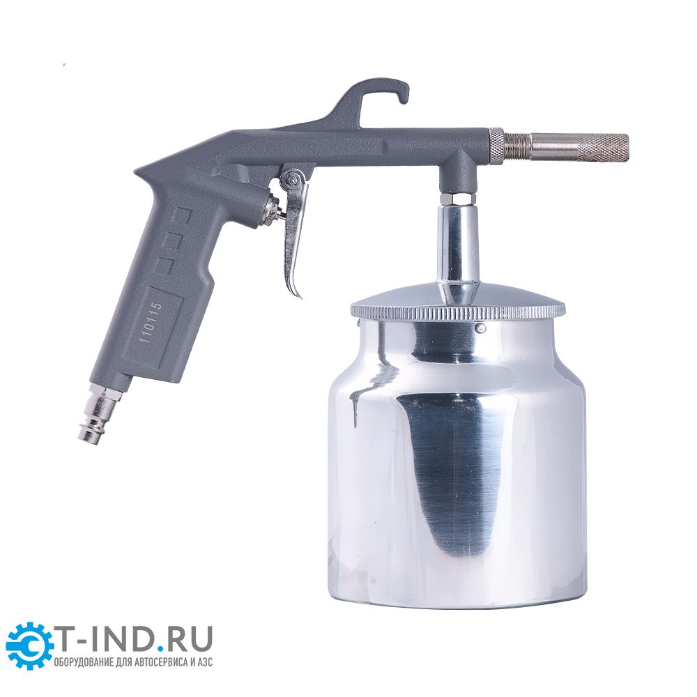 Пневмопистолет пескоструйный с бачком. Используется для шлифовки деревянных, металлических, каменных поверхностей и подготовке их к нанесению лакокра сочных материалов. Продув совершается выходящим под давлением воздухом с абразивным веществом, которое подается через специальный шланг из бачка.