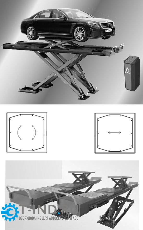 Подъёмник ножничный электрогидравлический Everlift EE-6603BWF.48L.42T.E.PD. Тип монтажа: заглубленный (комплект для напольной незаглубленной установки - доп. опция). Применяется для поста сход-развал (задние подвижные пластины, ниши под передние поворотные круги, возможность изменять положение поворотных кругов в зависимости от длины обслуживаемого автомобиля).