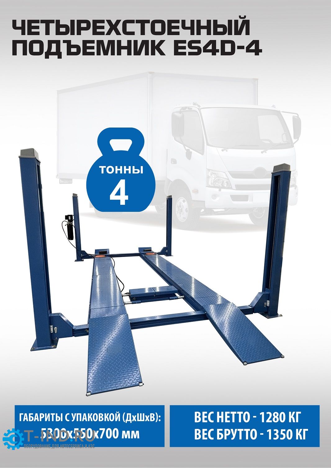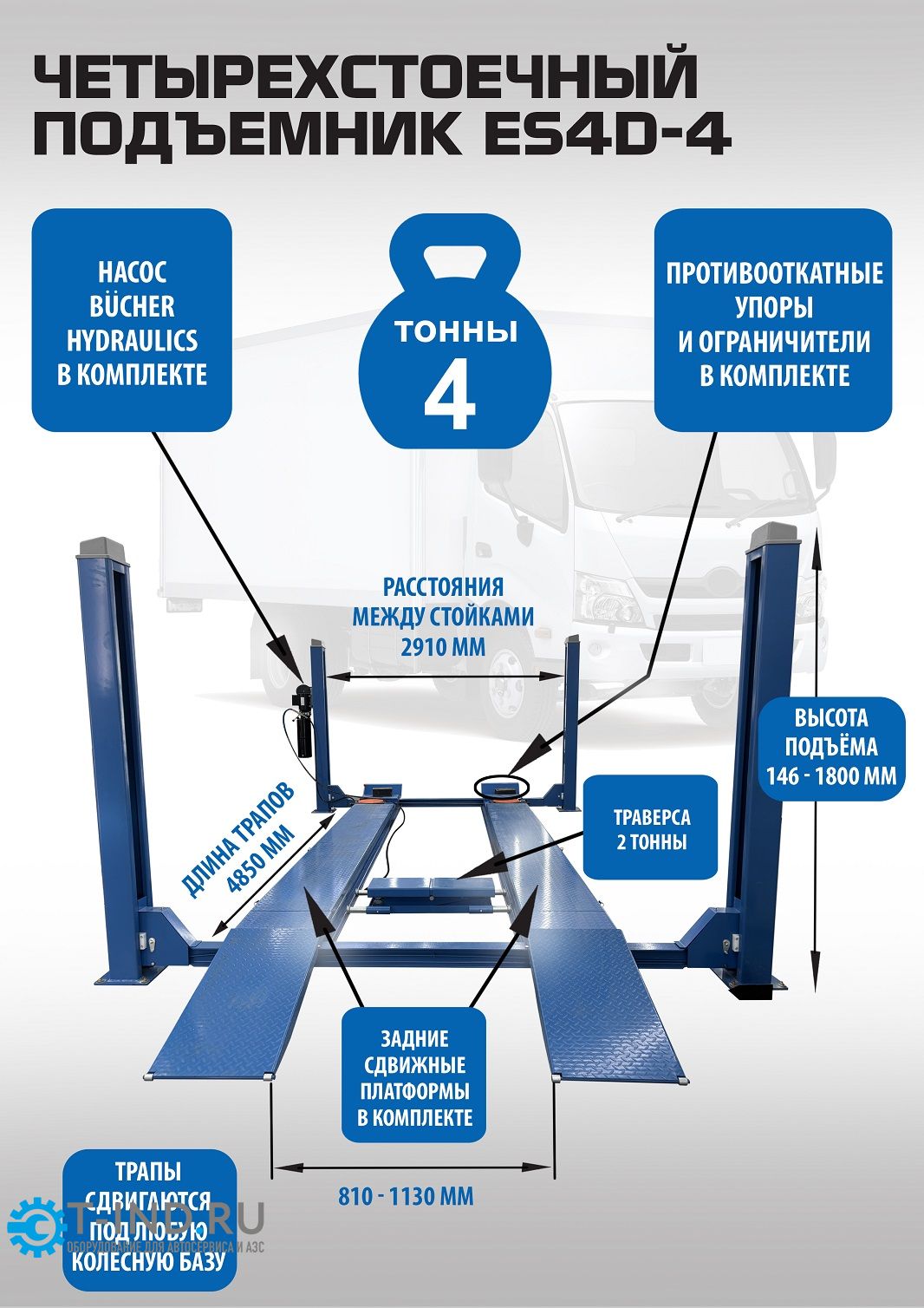 EQFS ES4D-4 Подъемник 4-хст. г/п 4т. электрогидравлический с траверсой для сход-развала всех авто от Матиза до длинной Газели и всех внедорожников. Для всех типов стендов сход-развал в т.ч 3D и 3D с прокаткой, между колоннами расстояние 2910 мм. Длина платформ 4850 мм. Подъём 1800 мм. В комплекте: Немецкий насос «Bucher hydraulics» траверса 2т. + анкерные болты 16шт. + противооткатные ограничители 2шт. + противооткатные упоры 2шт.