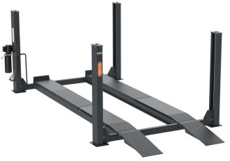 Подъемник четырехстоечный электрогидравлический для поста "сход-развал" Dekar HFL4165E. Задние подвижные пластины, углубления под передние поворотные круги с возможностью изменять их положение в зависимости от длины обслуживаемого автомобиля (круги - не входят в комплект). Удобная и функциональная разблокировка предохранительных стопоров посредством встроенных пневмоцилиндров (управление - рычагом).
