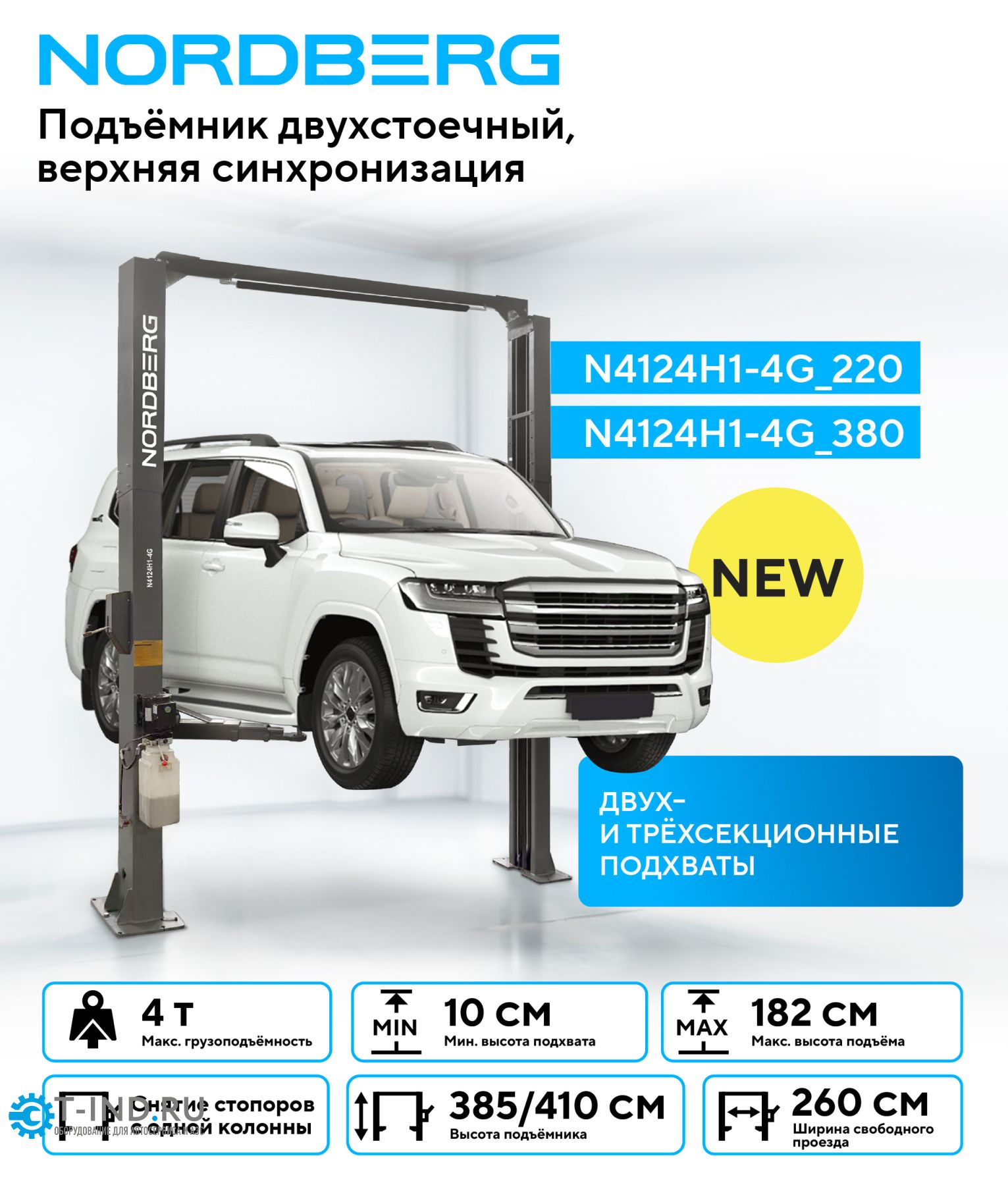 NORDBERG N4124H1-4G_220 — электрогидравлический двухстоечный подъёмник с верхней синхронизацией, грузоподъёмностью 4 тонны, 380 В. Предназначен для подъема и удержания автомобилей в поднятом положении обеспечивая доступ к узлам и агрекатам для проведения различных видов работ.