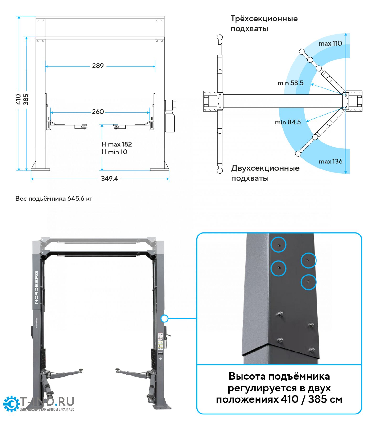 Подъемник двухстоечный автомобильный 4 тонны Nordberg N4124H1-4G_220, электрогидравлический, 220В