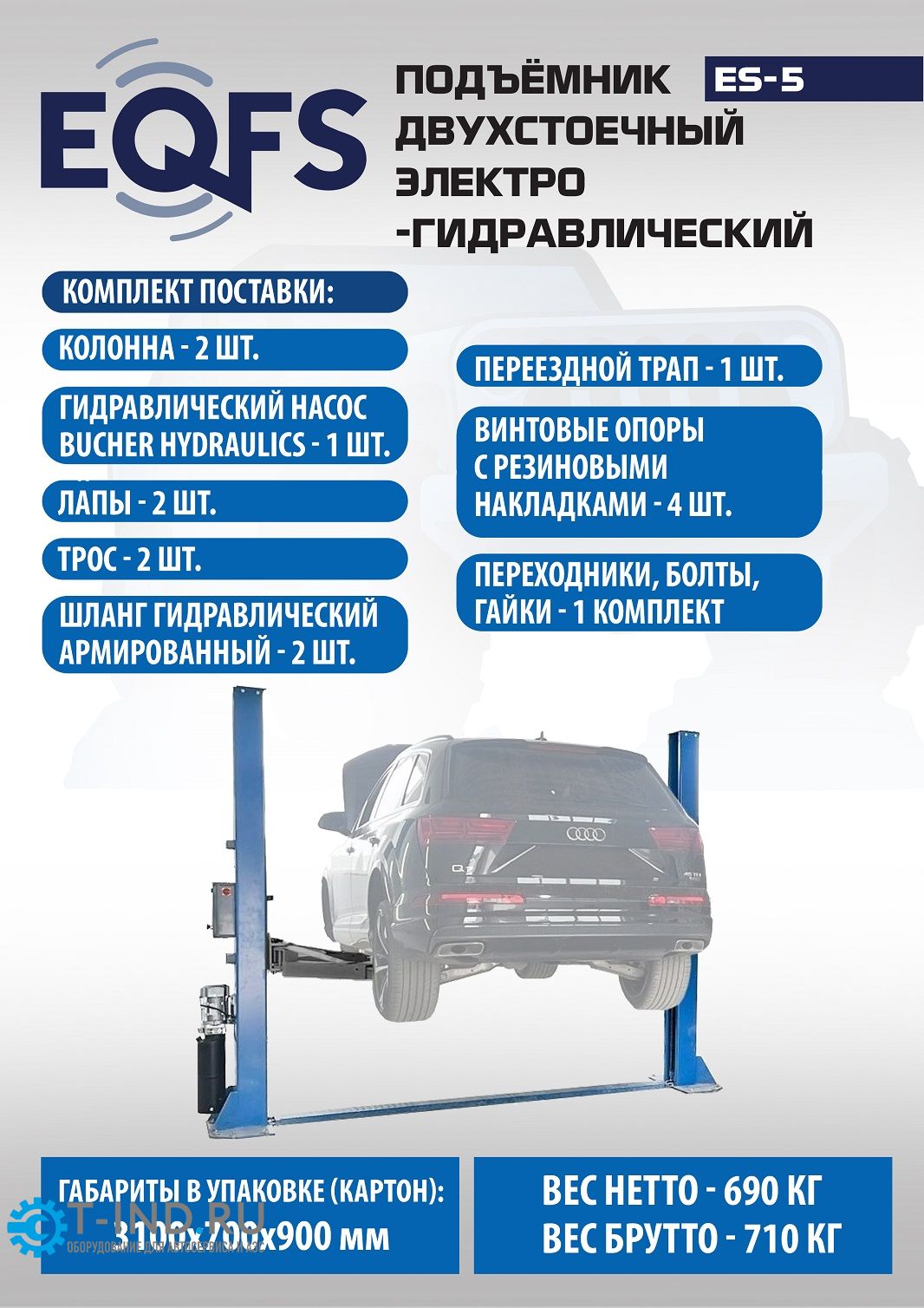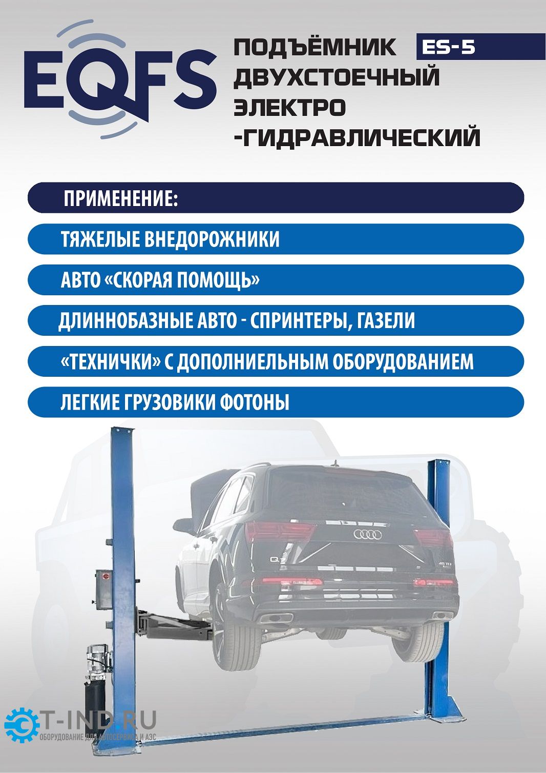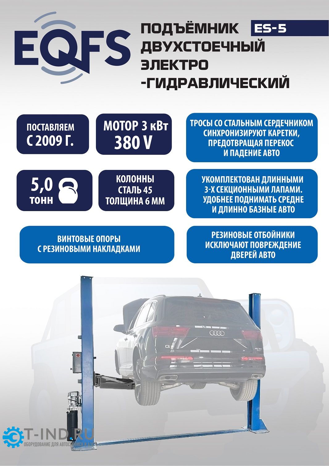 Подъемник двухстоечный автомобильный 5 тонн EQFS ES-5, электрогидравлический, 380В