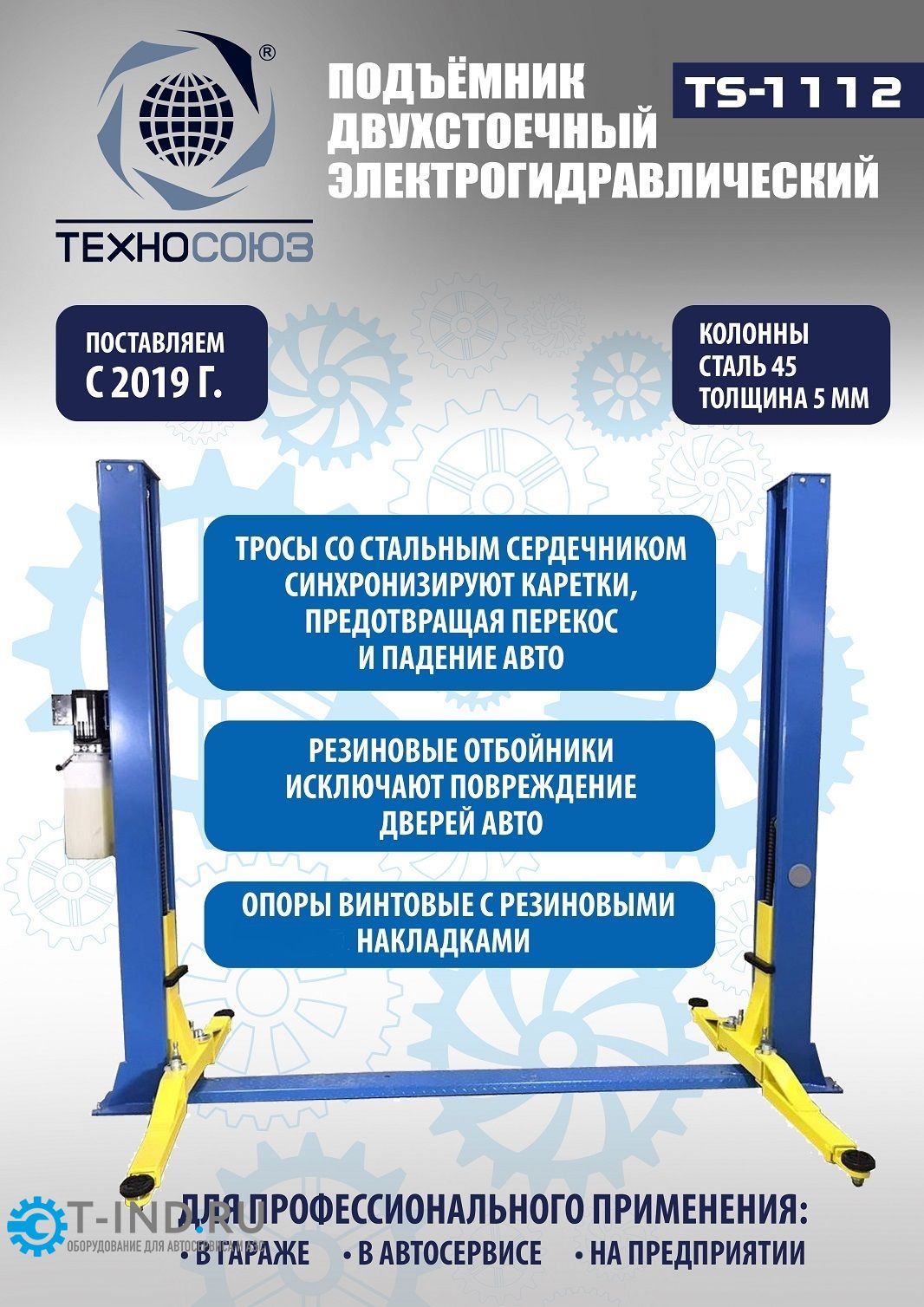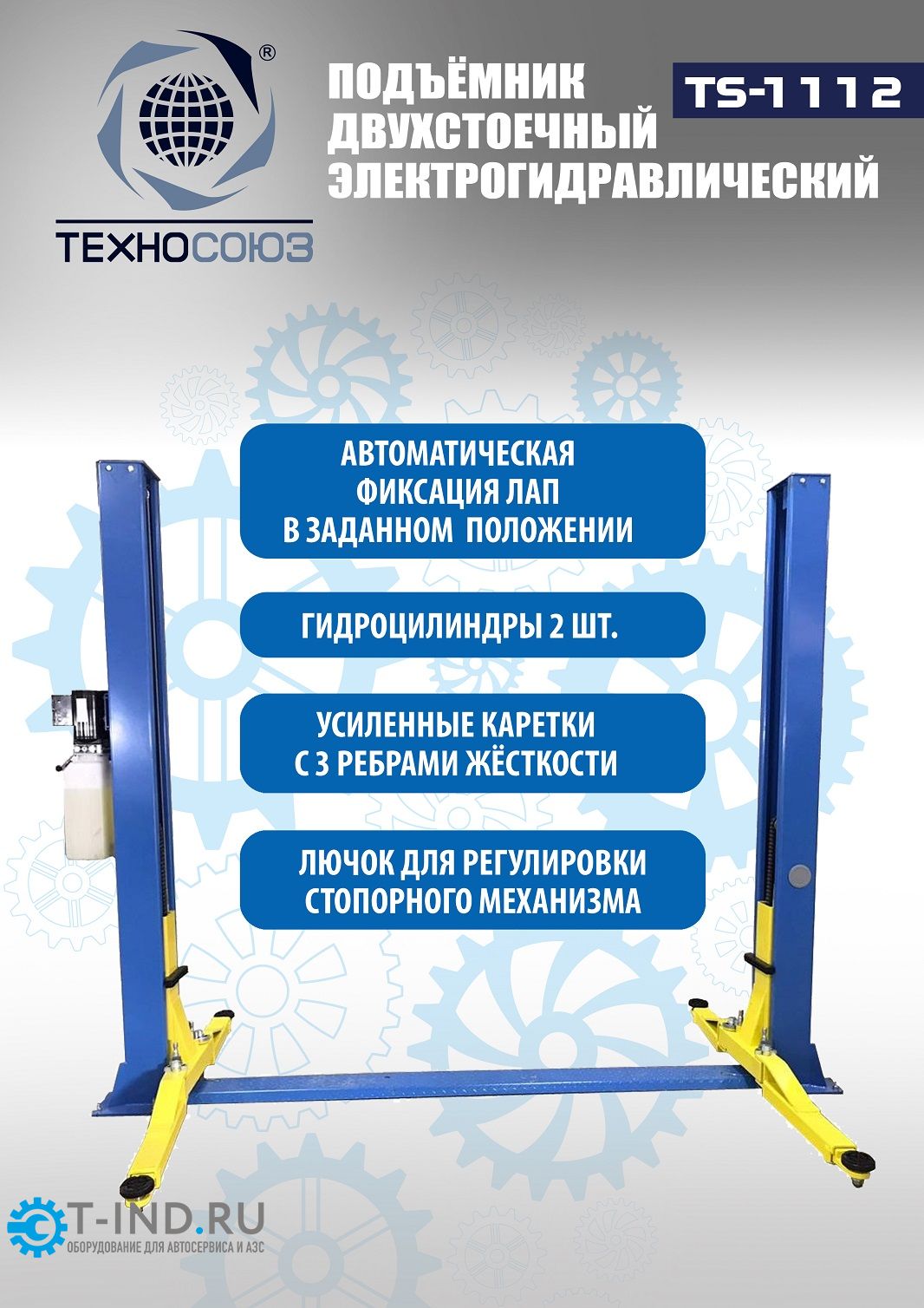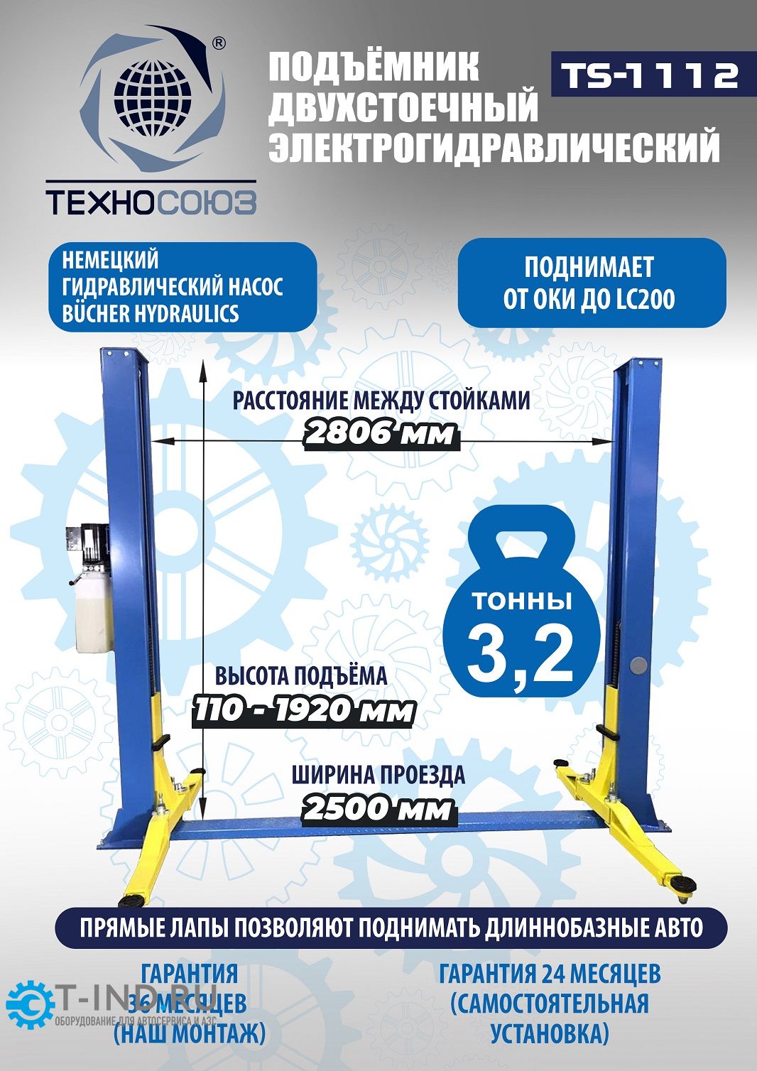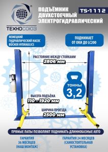Подъемник двухстоечный автомобильный 3,2 тонны Техносоюз TS-1112, гидравлический, 220/380В