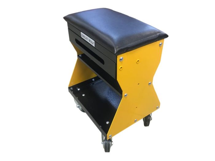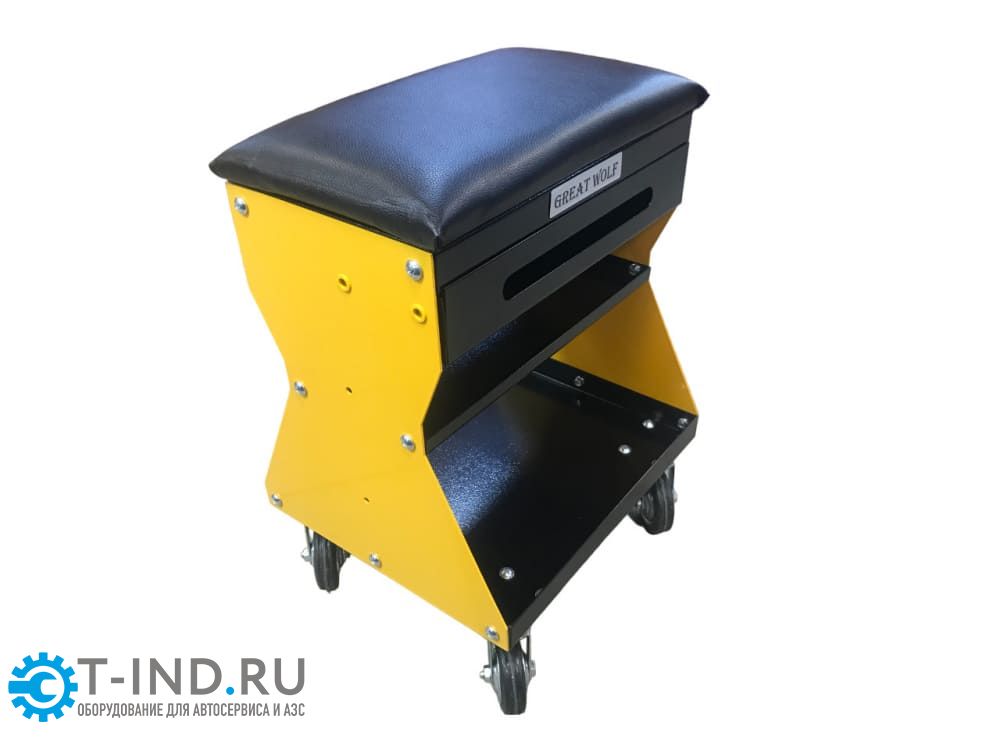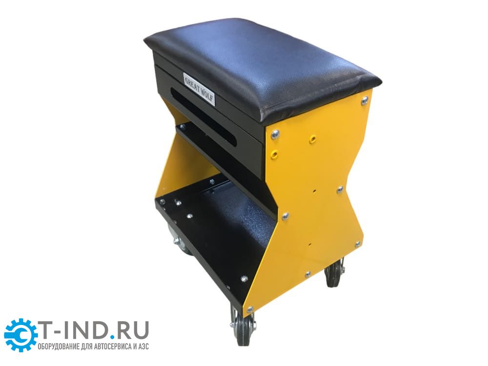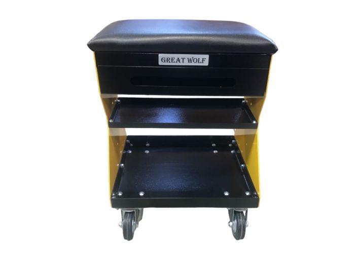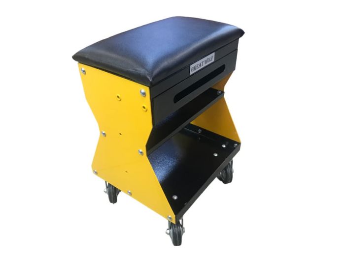 Подкатной ремонтный стул GWT-Y1 Great Wolf. Рассчитано на нагрузку до 130 кг. Имеет 2 полки и выдвижной ящик для инструментов, а также есть возможность для установки дополнительных полок или кронштейнов по бокам.