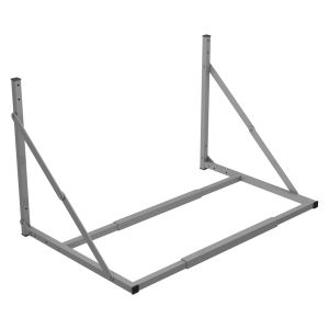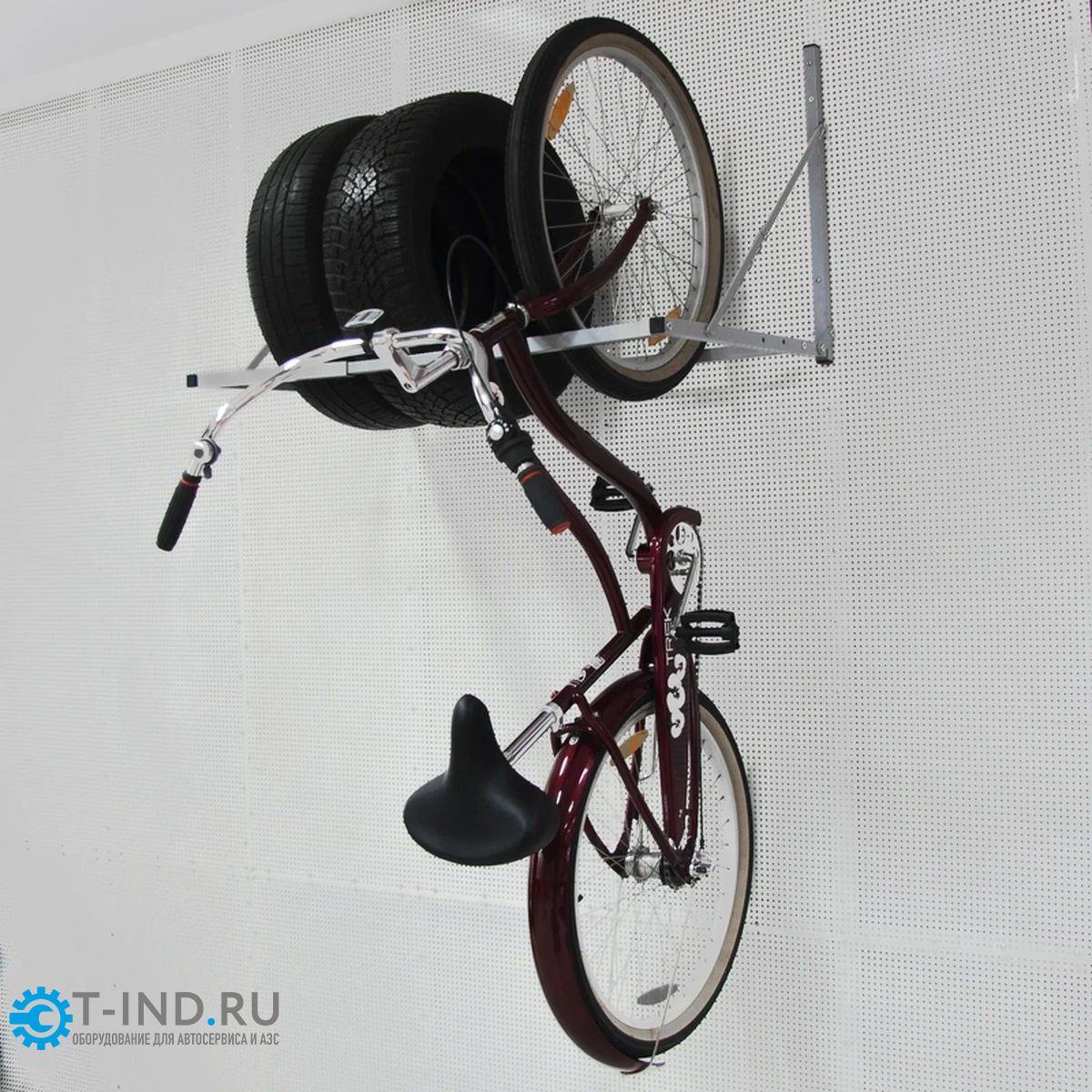 Полка выполнена из прочной стали. Конструкция имеет шесть крепёжных отверстий и выдерживает вес до 125 кг. Ложемент регулируется под колёса разного размера и диаметра. Приспособление отлично подойдёт для балкона, кладовки, гаража или мастерской.