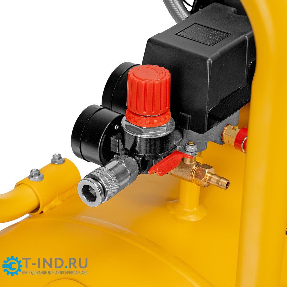 - Контроль работы — компрессор оснащен 2 манометрами для отслеживания давления в ресивере и пневмолинии