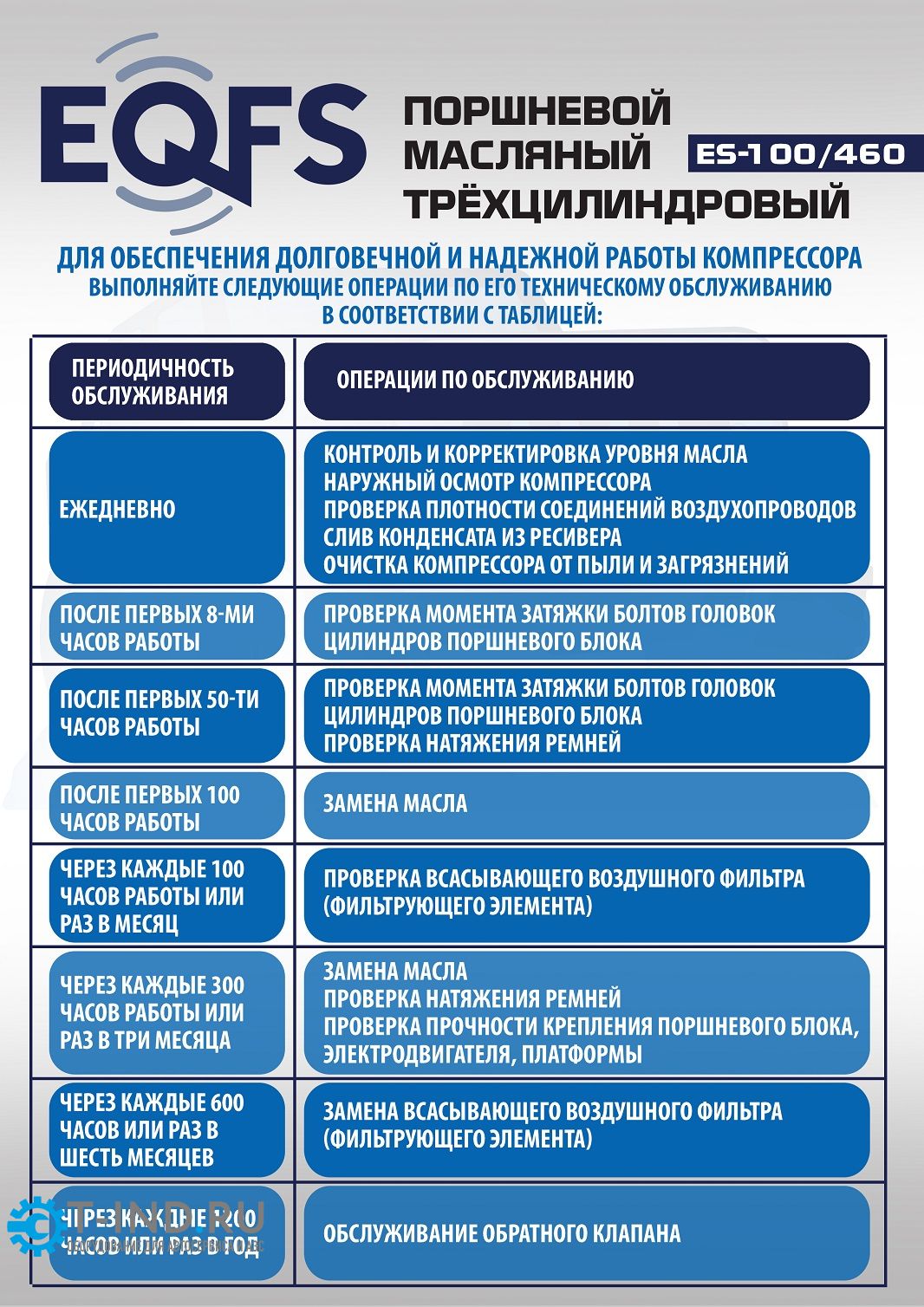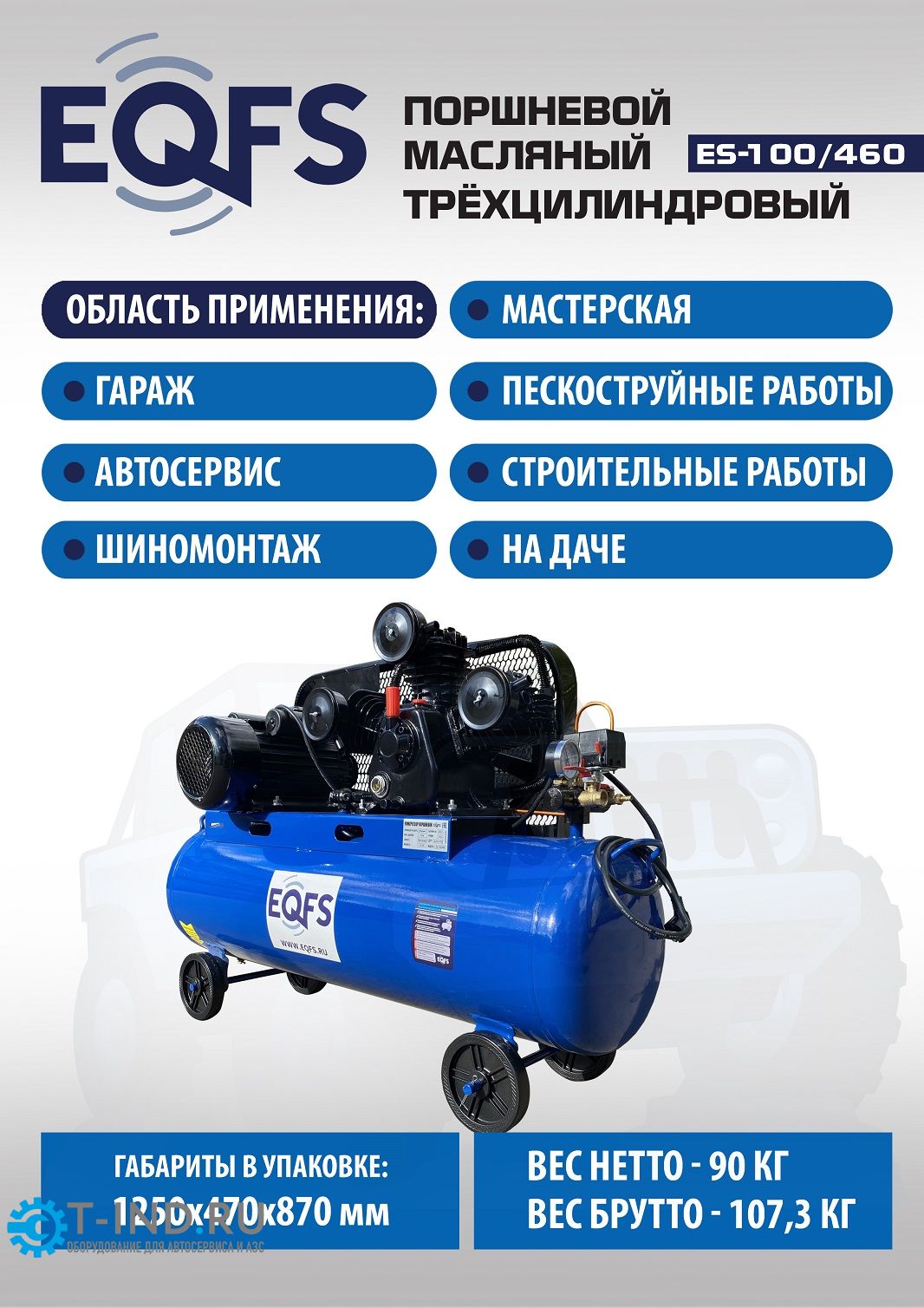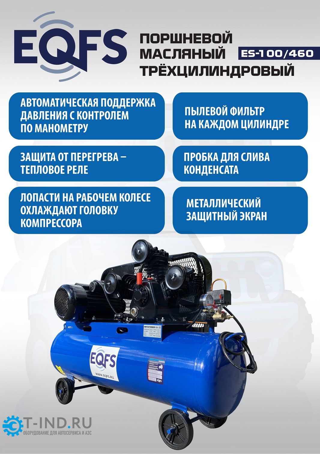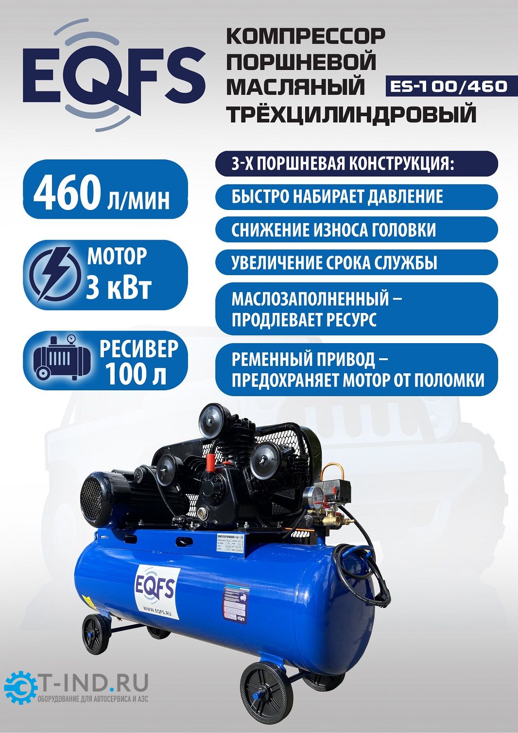 Компрессор воздушный EQFS ES-100/460, передвижной, поршневой, масляный, трёхцилиндровый. Быстро набирает давления. Трёхпоршневая головка двигателя уменьшает износ деталей и увеличивает срок службы. Ремённый привод — предохранят мотор от поломки. Идеальное решение для небольшой мастерской, шиномонтажа, автосервиса, гаража. Давление 8 Атм. Производительность 460 л/мин. Мощность 3 кВт. Напряжение 220В. Ёмкость ресивера 100 л. Гарантия 12 месяцев. Для корректной эксплуатации необходимо обеспечение мощности питающей сети с номинальным током 25А и напряжение 220V.
