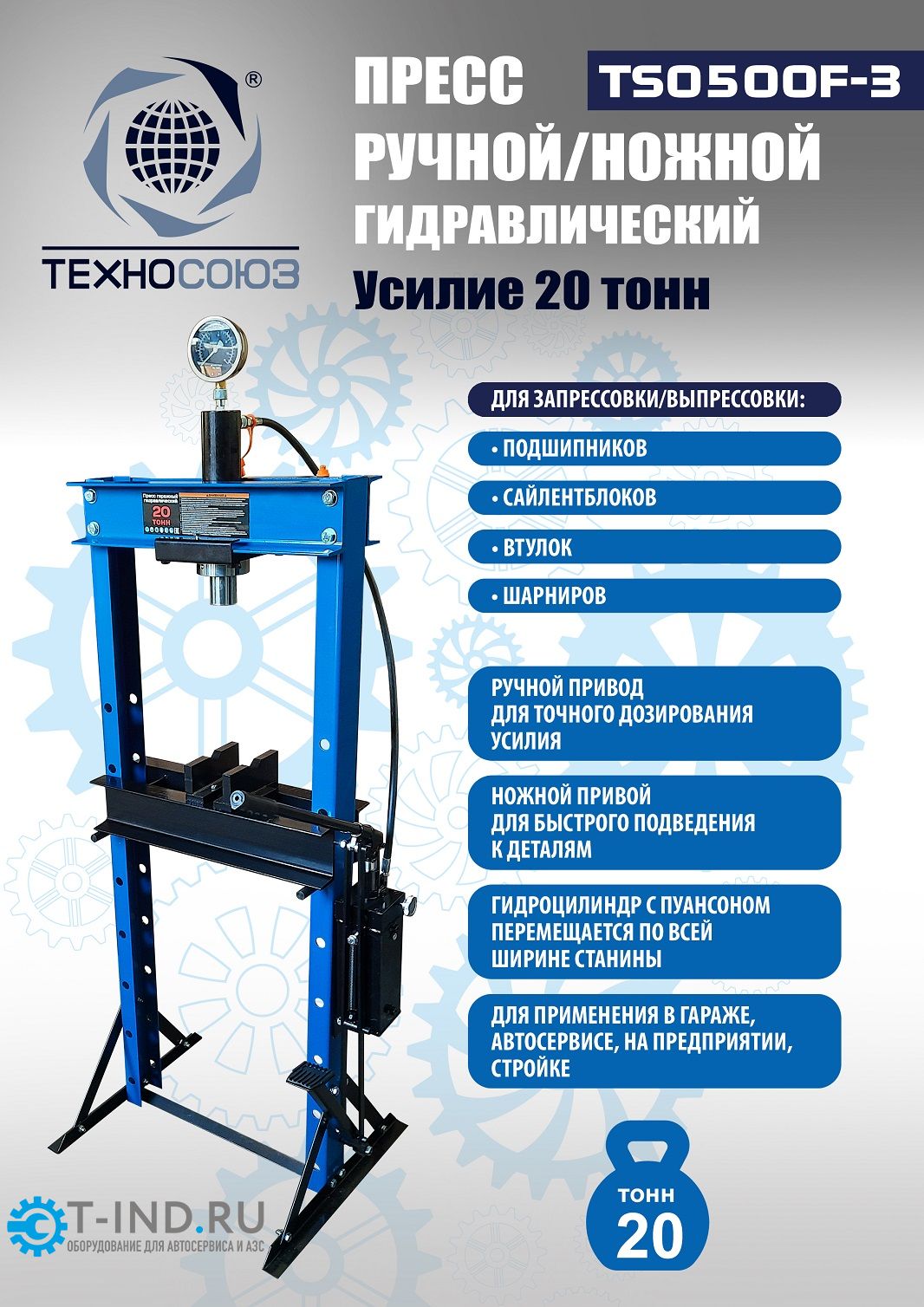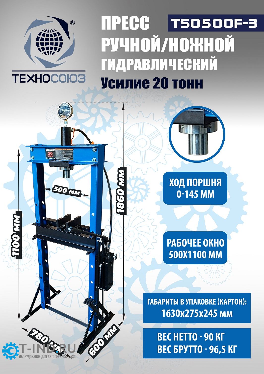 Пресс гидравлический ручной/ножной Техносоюз TS0500F-3 усилие 20 тонн. «Свободные руки». ножной / ручной. Пуансон 0-145 мм. Рабочее окно 500х1110 мм. Доставка по РФ и ТС. Поршень приводится в действие нажатием на ручку или педаль. Рекомендуется для выпрессовки деталей машин, втулок и т.п. в автосервисе, Гараже и СТО. Гидроцилиндр с пуансоном имеет возможность перемещения по всей ширине станины. Подъёмная площадка регулируется по высоте и фиксируется в требуемом положении.