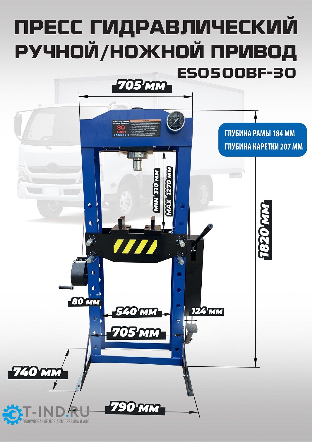 Пресс пневмогидравлический EQFS ES0500BF-30. Полностью сварная рама, усилие 30 тонн, управление ручное/ножное, клапан защиты от перегрузки, манометр, гидроцилиндр с пуансоном перемещается по всей ширине каретки. Ход поршня 150 мм. Рабочее окно: 540х1126 мм. Рекомендуется для выпрессовки подшипников, деталей машин, втулок и т.п. в автосервисе, Гараже и СТО.
