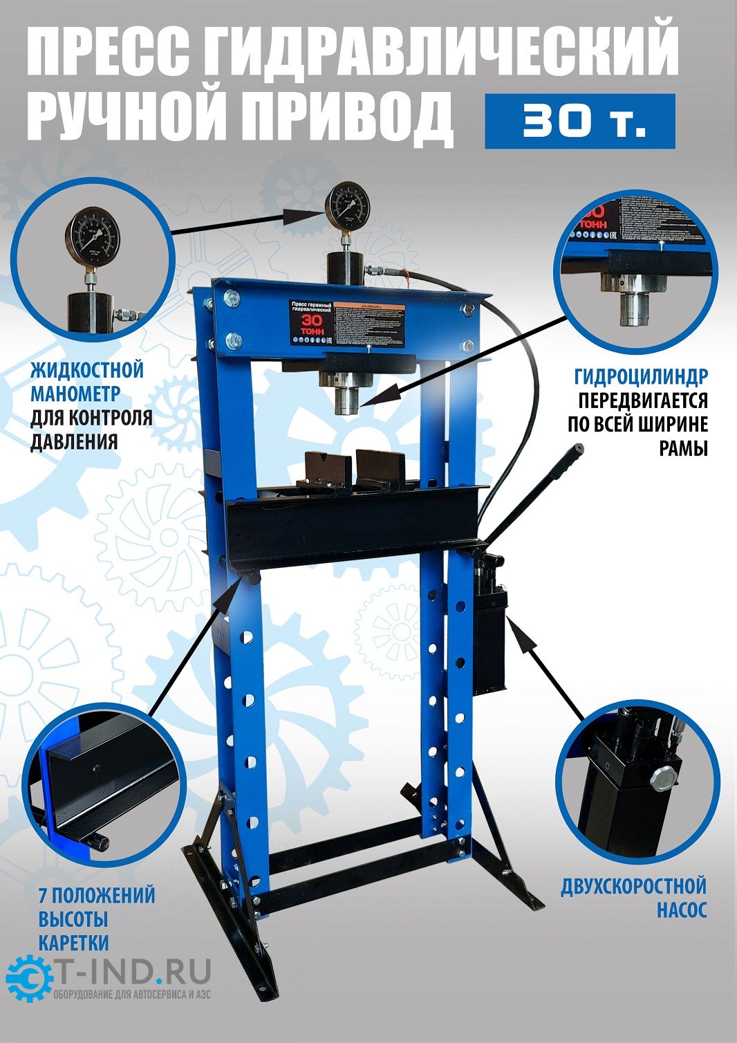Пресс гидравлический ручной для автосервиса Техносоюз TS0500-4, усилие 30 т. Насос — 2 плунжера. Ход поршня 160 мм. Рабочее окно 530х980 мм. Поршень приводится в действие нажатием на ручку. Рекомендуется для выпрессовки деталей машин в автосервисе. Гидроцилиндр передвигается по всей ширине рамы, с возможностью установки в любом месте.
