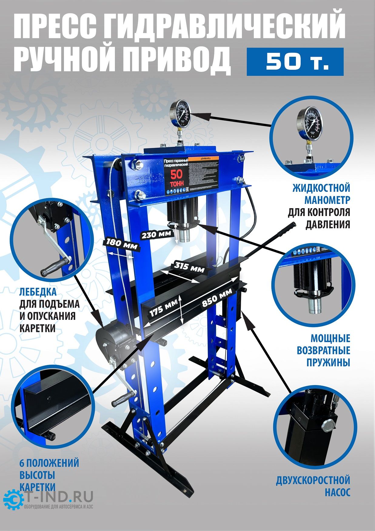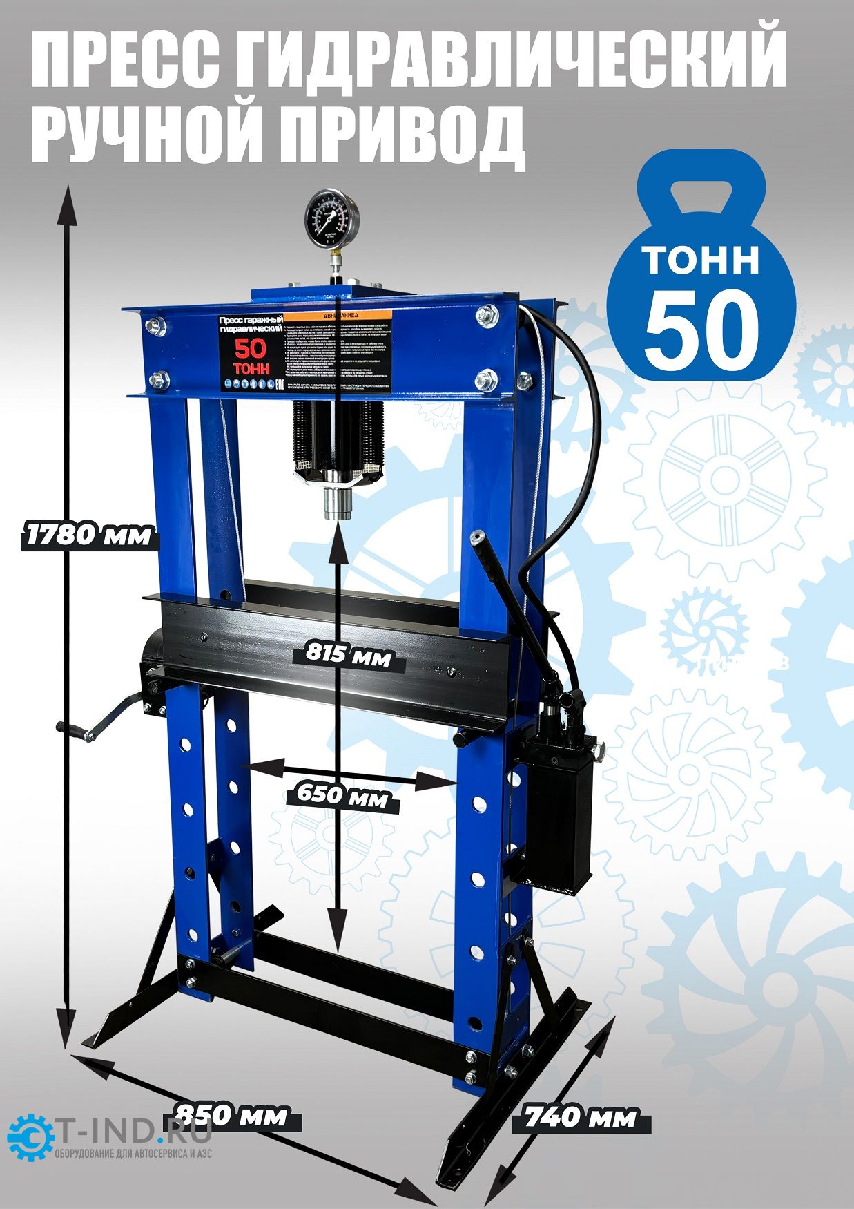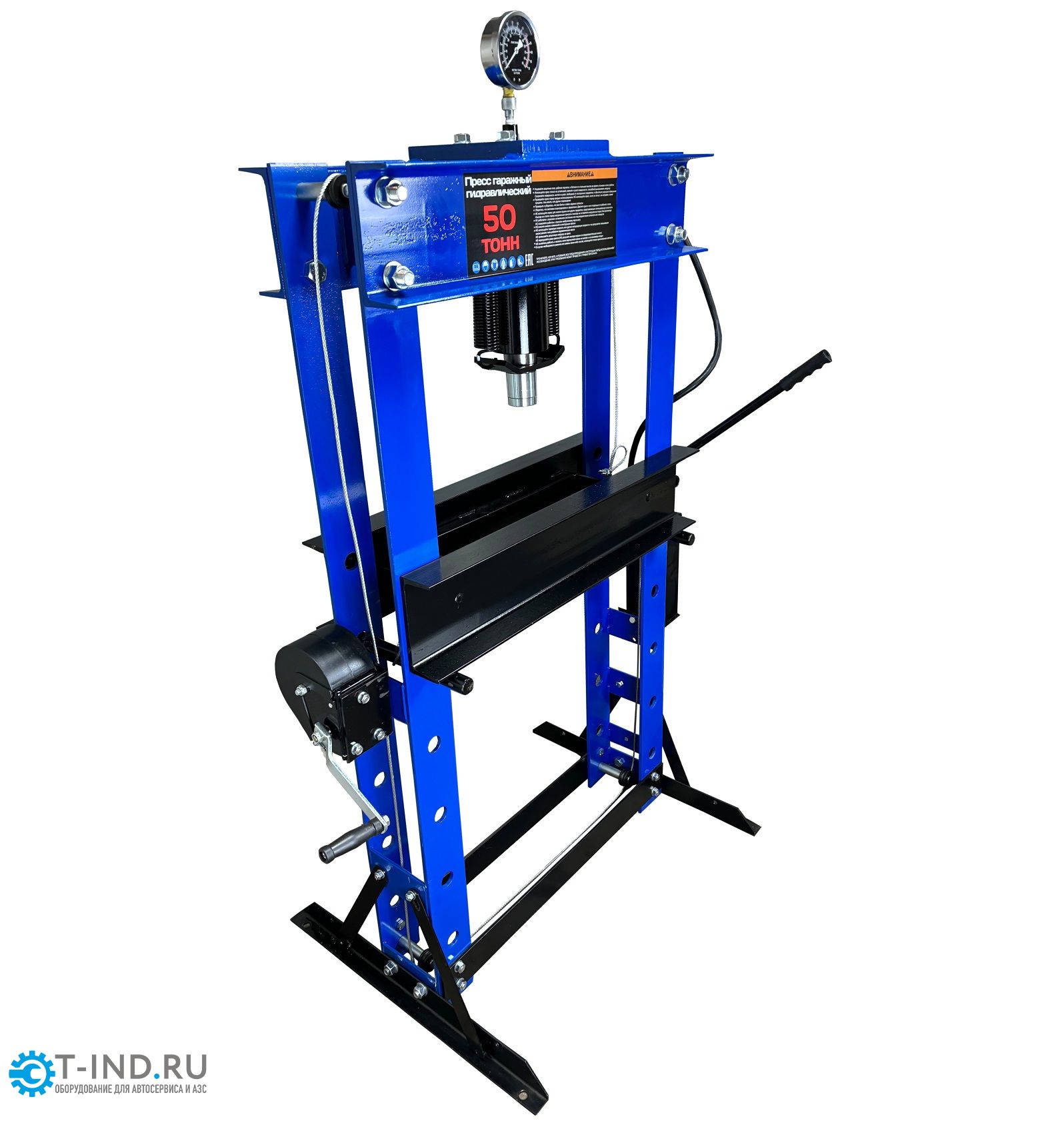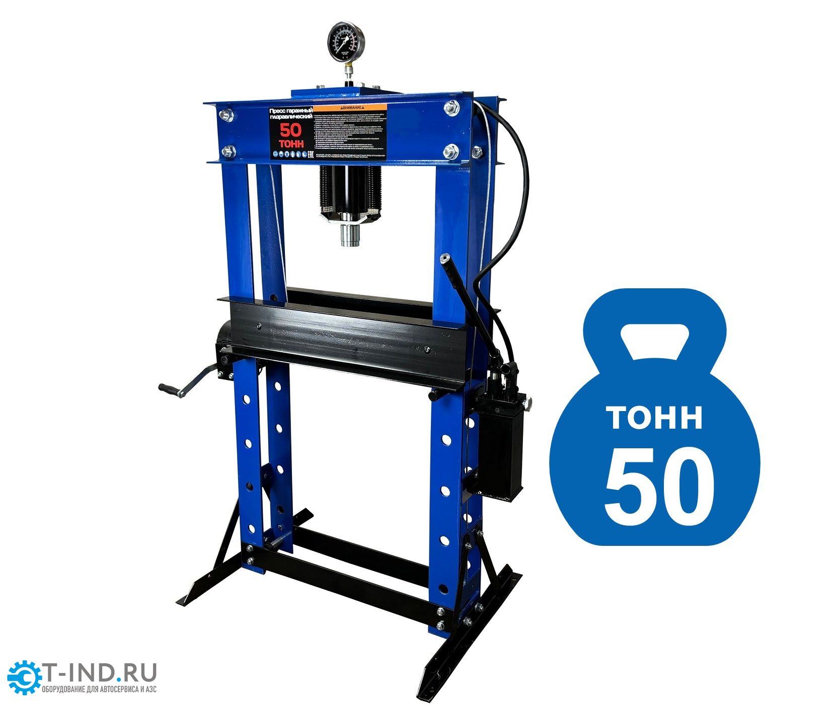 Пресс гидравлический ручной для автосервиса Техносоюз TS0500-6, усилие 50 т. Две скорости подачи пуансона. Первая скорость для быстрой подачи штока к рабочей поверхности, вторая (медленно) для выпрессовки. Применяется для запрессовки деталей машин и механизмов в гаражах, автосервисах и СТО. Цвет синий.