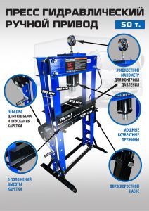 Пресс гидравлический, ручной усилие 50т. Две скорости подачи пуансона. Первая скорость для быстрой подачи штока к рабочей поверхности, вторая (медленно) для выпрессовки. Применяется для запрессовки подшипников, деталей машин и механизмов в гаражах, автосервисах и СТО.