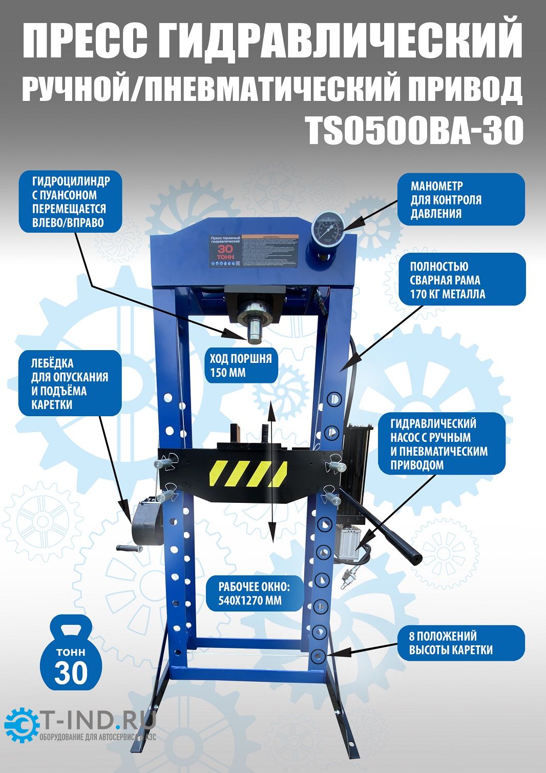 Пресс пневмогидравлический 30 тонн Техносоюз TS0500BA-30. Полностью сварная рама, усилие 30 тонн, управление ручное/пневматическое, клапан защиты от перегрузки, манометр, гидроцилиндр с пуансоном перемещается по всей ширине каретки. Ход поршня 150 мм. Рабочее окно: 540х1126 мм. Рекомендуется для выпрессовки подшипников, деталей машин, втулок и т.п. в автосервисе, Гараже и СТО.