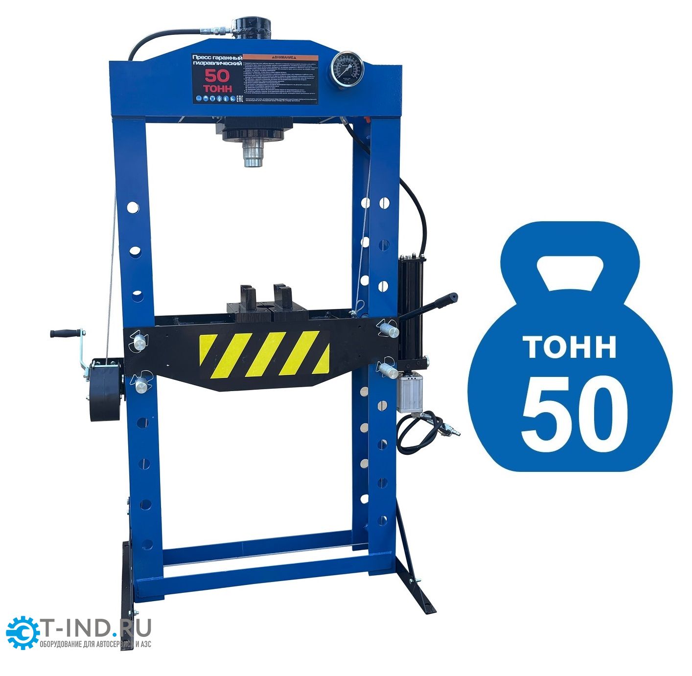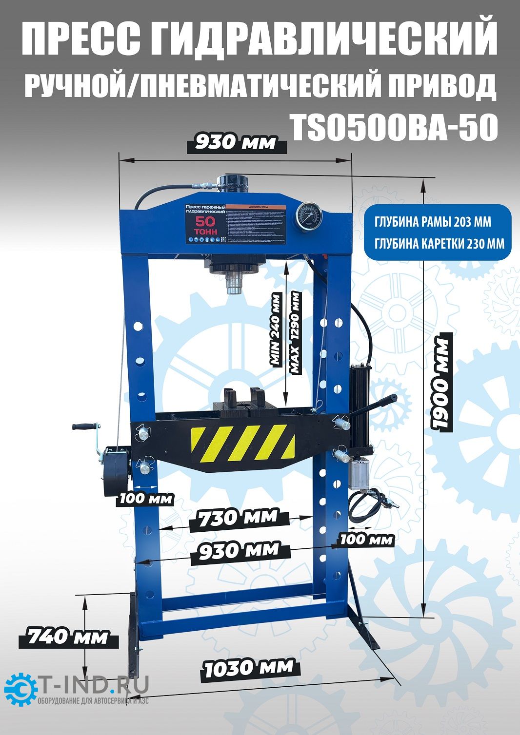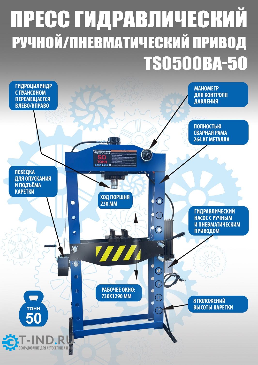 Пресс пневмогидравлический 50 тонн Техносоюз TS0500BA-50. Полностью сварная рама, усилие 50 тонн, управление ручное/пневматическое, клапан защиты от перегрузки, манометр, гидроцилиндр с пуансоном перемещается по всей ширине каретки.Ход поршня 220 мм. Рабочее окно 730х1068 мм. Рекомендуется для выпрессовки подшипников, деталей машин, втулок и т.п. в автосервисе, Гараже и СТО.