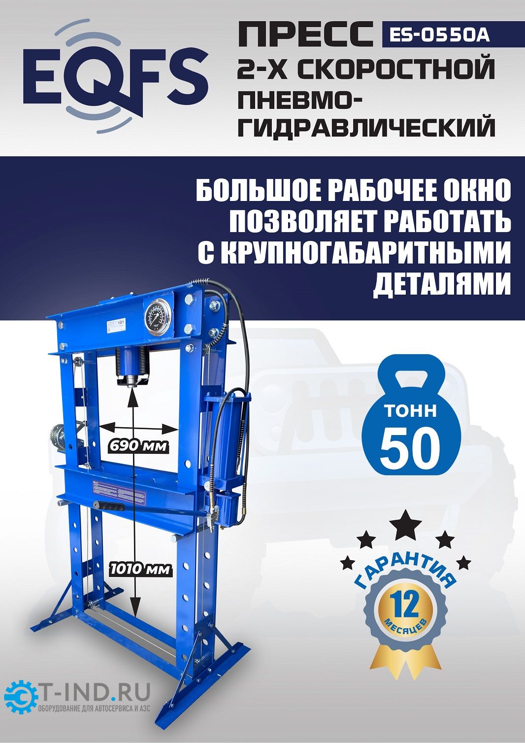 Пресс пневмогидравлический — для увеличения скорости работы неответственных деталей (втулки), где есть поток по выпрессовки, ручной привод — для точного дозирования усилия ответственных деталей (подшипники). Насос — 2 плунжера. Лебёдка для подъёма/опускания каретки. Манометр. Рекомендуется для выпрессовки подшипников, деталей машин, втулок и т.п. в автосервисе. Усилие 50 тонн. Рабочее окно 690х1010 мм.