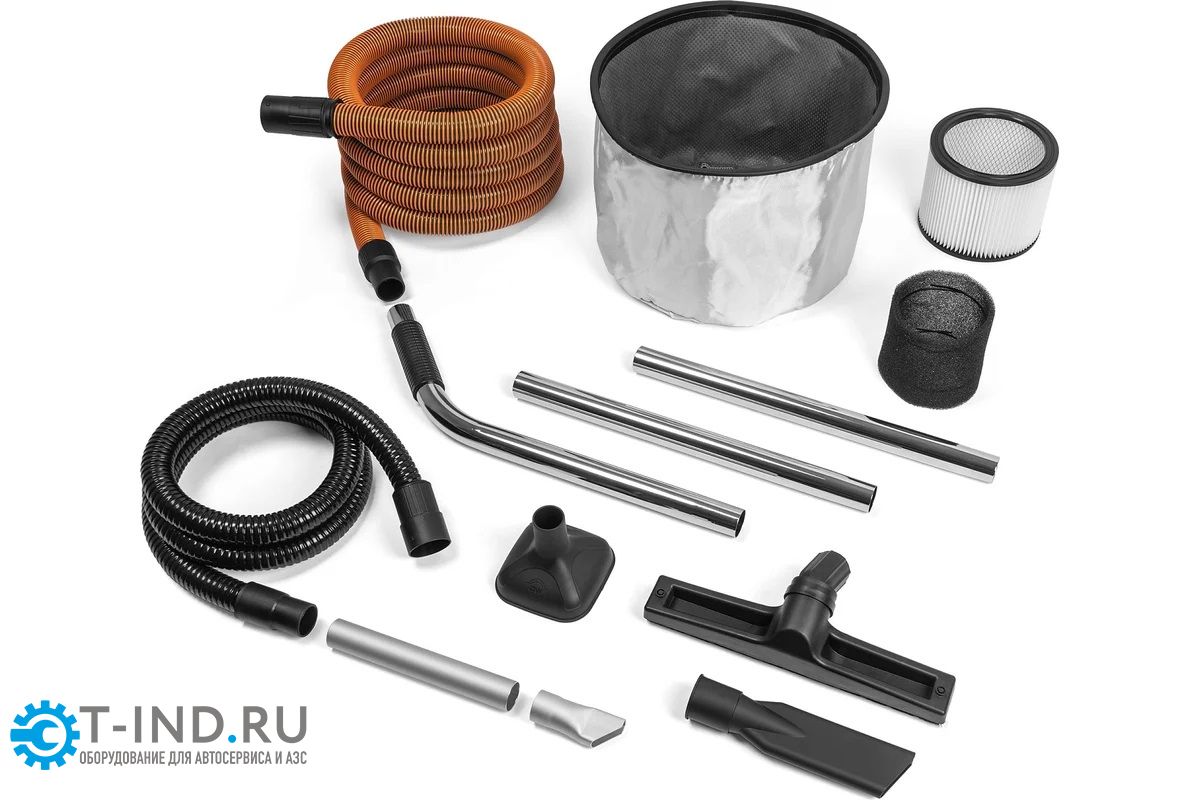 - Благодаря стойкости к высоким температурам и наличию второго армированного металлического шланга и алюминиевых насадок подходит для сбора золы и очистки дымоходов от золы и сажи.