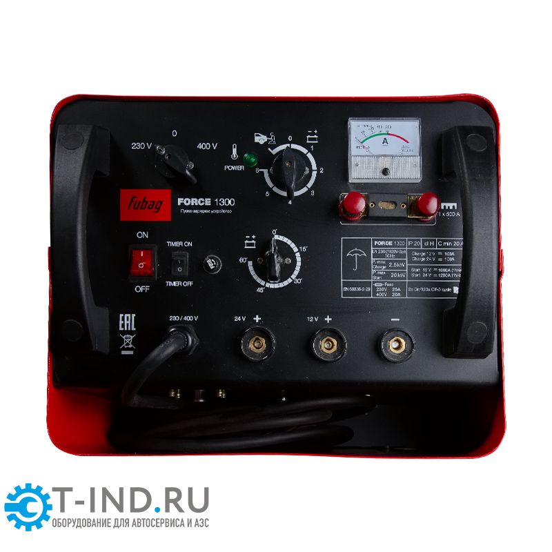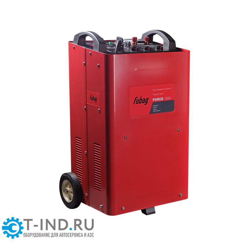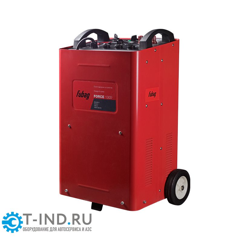 Мощное пуско-зарядное устройство FUBAG FORCE 1300 работает на напряжении 380 / 220 В при максимальном токе пуска 1200 А и токе зарядки 45-130 А. Устройство предназначено для использования в течение всего года в крупных автохозяйствах для быстрой зарядки кислотных аккумуляторов и запуска всех типов легковых автомобилей, фургонов, грузовиков или тракторов. Пуско-зарядное устройство FORCE 1300 может зарядить даже полностью разряженную аккумуляторную батарею или группу аккумуляторов одинакового напряжения (12 или 24 В) одновременно.