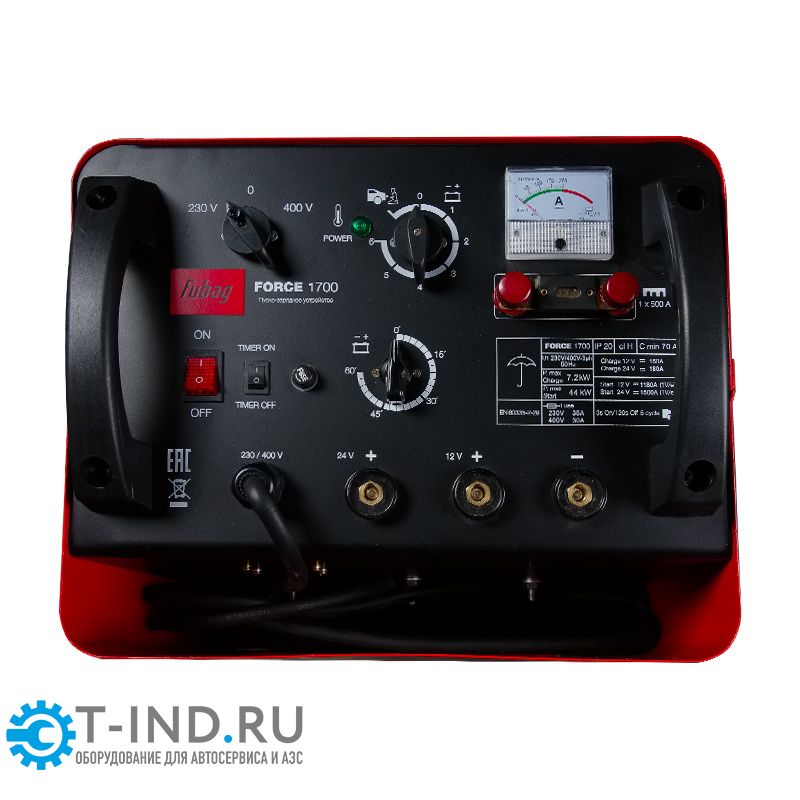 Мощное пуско-зарядное устройство FUBAG FORCE 1700 работает на напряжении 380 / 220 В при максимальном токе пуска 1500 А и токе зарядки 50-280 А. Устройство предназначено для использования в течение всего года в крупных автохозяйствах для быстрой зарядки кислотных аккумуляторов и запуска всех типов легковых автомобилей, фургонов, грузовиков или тракторов. Пуско-зарядное устройство FORCE 1700 может зарядить даже полностью разряженную аккумуляторную батарею или группу аккумуляторов одинакового напряжения (12 или 24 В) одновременно.