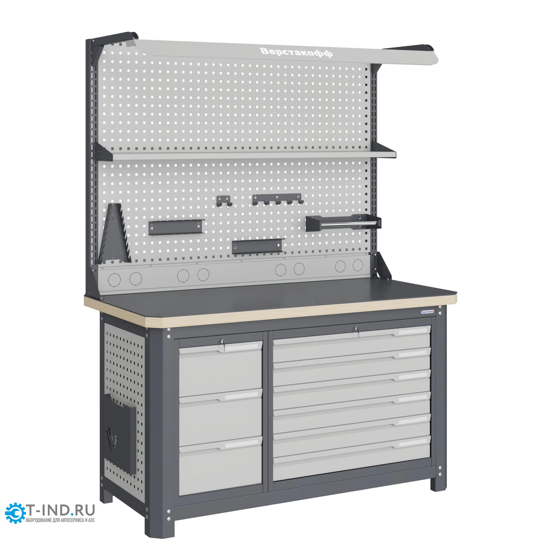 Внутренние размеры малых ящиков (ВхШхГ), не более: 75 х 755 х 500 мм. Максимально допустимая масса груза, равномерно распределенного по поверхности любого выдвижного ящика 31 кг. Модули с ящиками снабжены общим центральным замком с поворотом ригеля 180 градусов и подпружиненной тягой. В комплекте два ключа для каждого замка. Квадратная перфорация на элементах верстака предназначена для установки крючков, держателей и других аксессуаров, имеет размеры: квадрат 12х12мм. шаг 38мм. Экран (перфорированная панель) верстака выполнен с квадратной перфорацией 12х12 мм с шагом 38 мм для установки крючков, держателей и других аксессуаров. Экран крепятся к столешнице с помощью специальных кронштейнов.