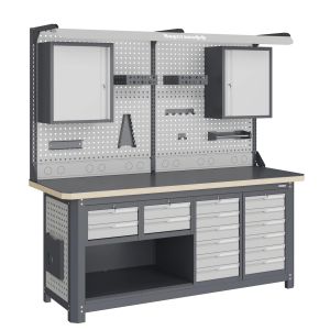 В комплекте два ключа для каждого замка. Квадратная перфорация на элементах верстака предназначена для установки крючков, держателей и других аксессуаров, имеет размеры: квадрат 12х12мм. шаг 38мм. Экран (перфорированная панель) верстака выполнен с квадратной перфорацией 12х12 мм с шагом 38 мм для установки крючков, держателей и других аксессуаров. Экран крепятся к столешнице с помощью специальных кронштейнов. Максимальная масса груза, равномерно распределенного по поверхности экрана, составляет 71 кг. Комплект освещения устанавливается над верстаком. В комплекте идет защитный козырек, кронштейны и лампа с магнитными креплениями, которые позволяют менять ее положение. Блоки коммуникаций устанавливаются совместно с экранами, в нижней части либо между экранами, предназначены для монтажа электрических приборов.