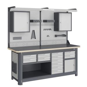 Комплект полка-стенка SW2 установлен под подвесным модулем. Размеры полки (ВхШхГ), не более: 35 х 415 х 619 мм. Размеры стенки (ВхШхГ), не более: 385 х 415 х 25 мм. Максимально допустимая масса груза, равномерно распределенного по поверхности полки 31 кг. Модули с ящиками снабжены общим центральным замком с поворотом ригеля 180 градусов и подпружиненной тягой. В комплекте два ключа для каждого замка. Квадратная перфорация на элементах верстака предназначена для установки крючков, держателей и других аксессуаров, имеет размеры: квадрат 12х12мм. шаг 38мм. Экран (перфорированная панель) верстака выполнен с квадратной перфорацией 12х12 мм с шагом 38 мм для установки крючков, держателей и других аксессуаров.