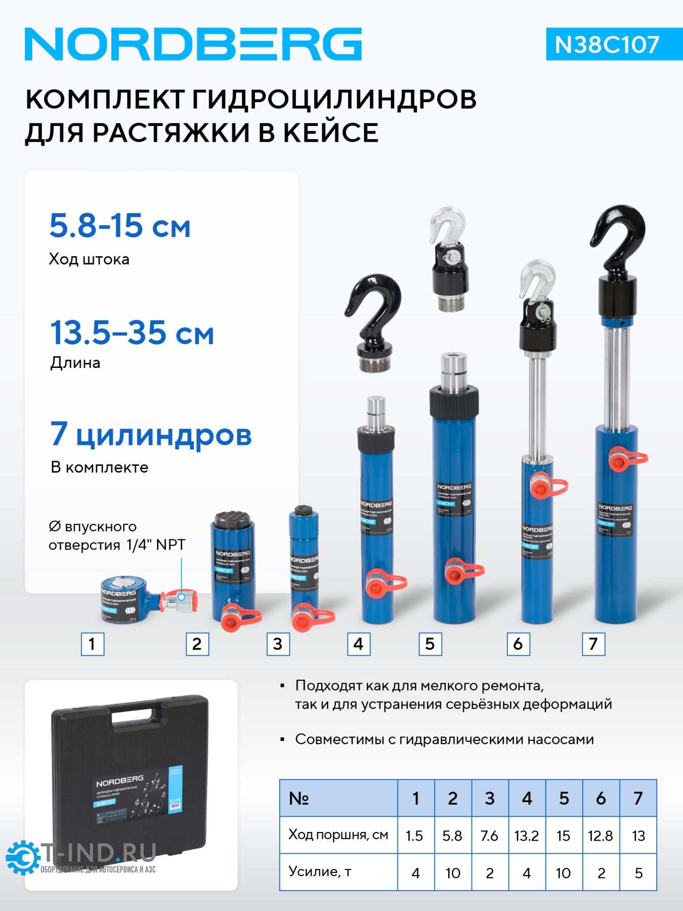 NORDBERG N38C107 — комплект гидравлических цилиндров для растяжки. Комплект предназначен для выполнения кузовных работ. Подходит для восстановления геометрии кузова автомобиля, включая труднодоступные участки. Разнотипные цилиндры в комплекте обеспечивают универсальное применение — от незначительных ремонтов до устранения серьёзных деформаций.
