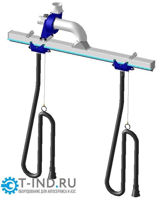 В комплектацию системы входит: профильный алюминиевый рельс, скользящие каретки, термостойкий шланг, подвес для шланга, вытяжные насадки, вытяжной вентилятор, кронштейны для крепления рельса, аксессуары для крепления и подключения вентилятора.