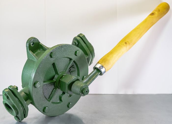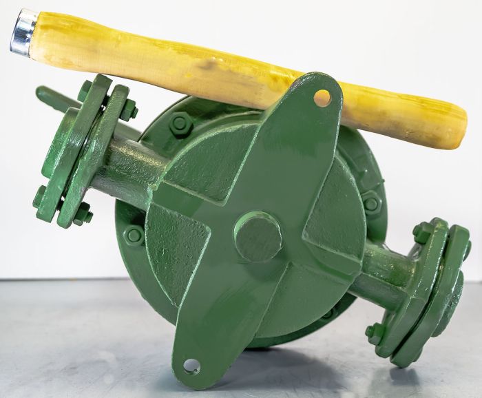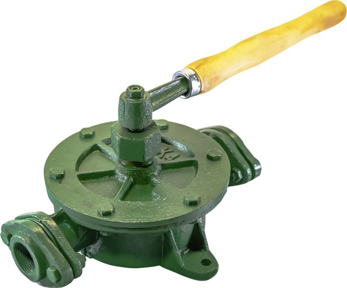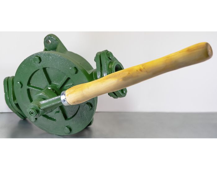 - Во время работы крыло вращается с помощью ручного рычага туда и обратно так, чтобы каждая сторона насоса поочередно всасывала или вытесняла свой объём и, таким образом, обеспечивалось непрерывное протекание жидкости. Базовая модель поставляется вместе с резьбовыми ответными фланцами.