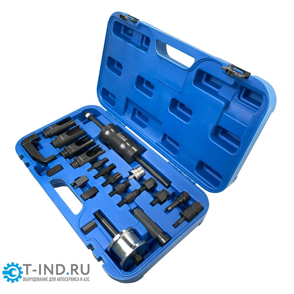 Съемник инжекторов дизелей TA-D1118-A можно использовать для демонтажа техники Bosch, Delphi, Denso, Siemens и Pumpe Duse. Большой комплект из ключей, обратных молотков и переходников позволяет работать, не повреждая агрегаты.