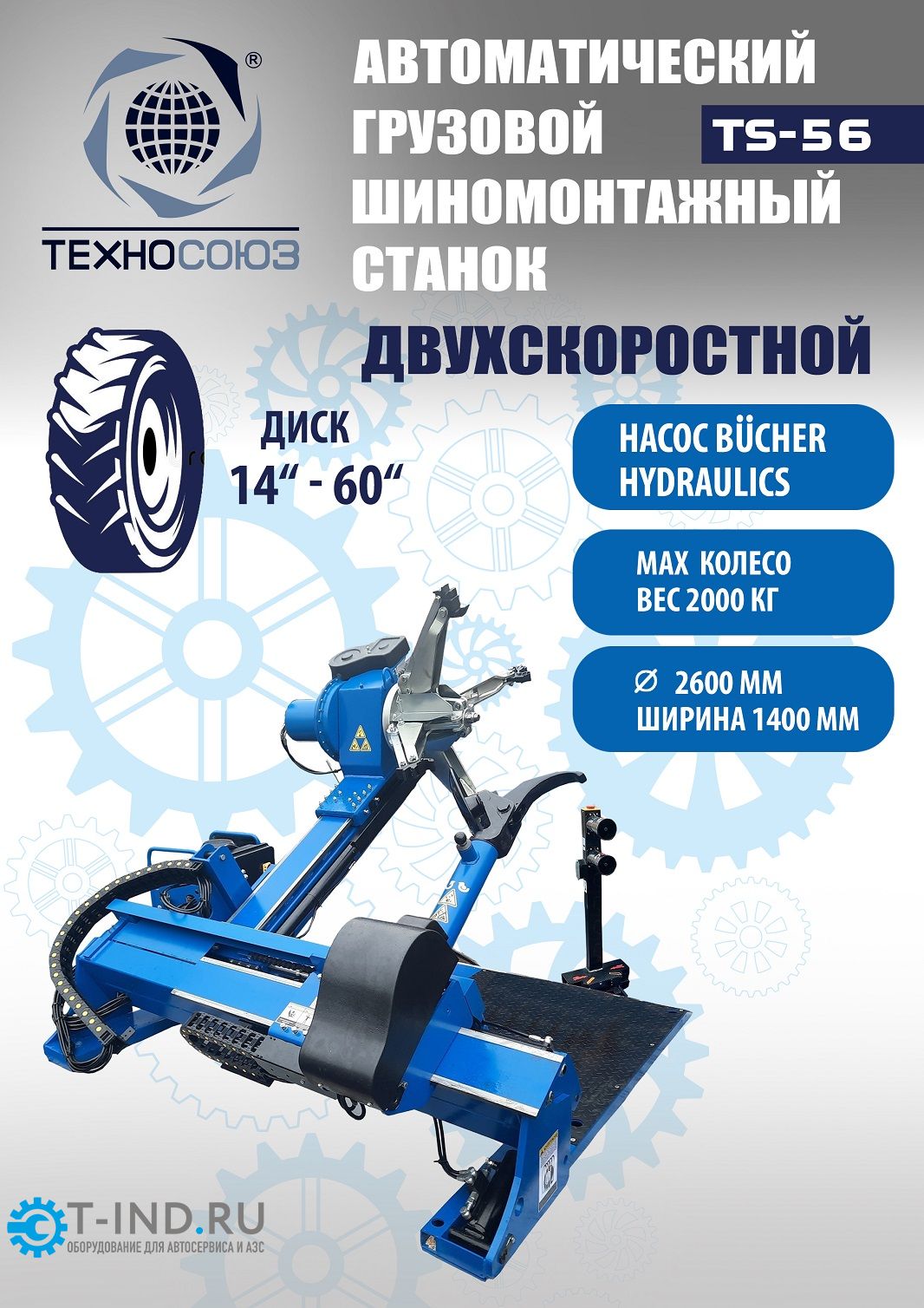 Двухскоростной. Моторы 4 + 4 кВт. Гидравлический насос – «BUCHER HIDRAULICS». Диски ALU, сталь, с кольцом и без 14÷60”. Колесо макс. Ø2600 мм, делает колеса "спарку" с шириной диска до 1400 мм. Вес колеса до 2000 кг. Грузовой шиномонтажный станок для тракторов, комбайнов, лесной и карьерной техники. Прост и удобен в эксплуатации. Отличное сочетание цены и технологических возможностей.