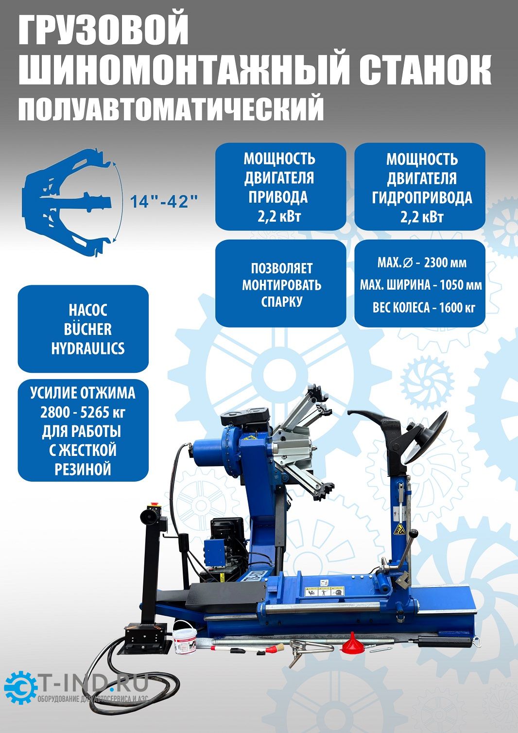 На станке установлены Моторы Привод 2,2кВт + Гидронасос 2,2 кВт. В комплекте: Немецкий гидравлический насос- "Bucher Hydraulics". Грузовые шиномонтажные станки класса «премиум» для «жестких» условий эксплуатации. Диски алюминий и сталь диаметром 14”-42”, с адаптерами 14”-52”, Максимальное колесо Ø2300 мм, позволяет делать колеса "спарку" с шириной диска до 1050 мм. Вес колеса до 1600кг. Отжим min-max. 2800-5265Н/м. Идеально подходит для тракторов, сельхозтехники, дорожной техники. Данные станки работают на поточных линиях сборки крупных грузовых автосборочных предприятиях России.