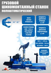 Качественный аппарат. Рекламаций нет. Диск, с кольцом и без, стальные + ALU 14-52”. Колесо Ø2300 мм, делает колеса "спарку" с шириной диска до 1050 мм. Вес колеса до вес до 1600 кг. У данной модели: привод 2,2кВт, мотор гидронасоса 2200 Вт. Отжим min-max. 2800-5265Н/м. Для монтажа/демонтажа покрышек траков, автобусов, сельскохозяйственной, строительной техники и тракторов. Оснащен гидравликой НЕМЕЦКОГО производства. Прост и удобен в эксплуатации. Отличное сочетание цены и технологических возможностей. Данные станки работают на поточных линиях сборки крупных грузовых автосборочных предприятиях России.
