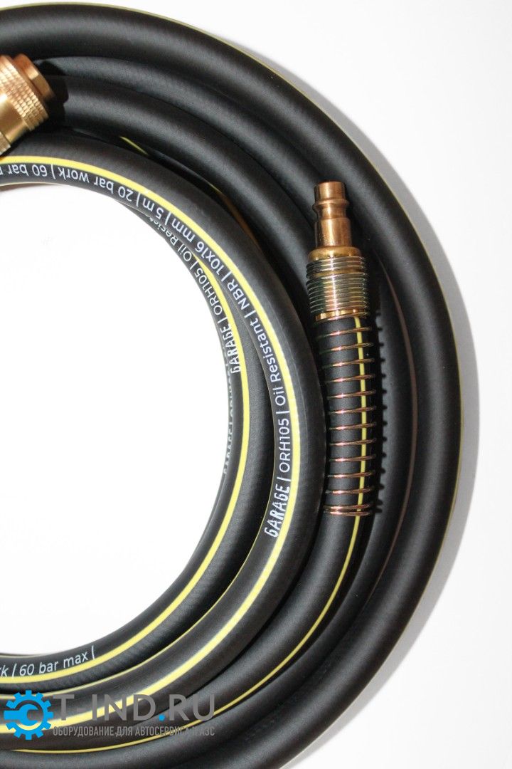 Шланг армированный маслостойкий 6/12 мм, 10 м Garage оснащен быстросъемными соединителями и применяется для соединения пневматического инструмента с компрессорами и линиями подачи сжатого воздуха.Изготовлен из нитрил-бутадиенового каучука с латунными переходниками.Рабочие давление 20бар. Максимальное давление 60бар.