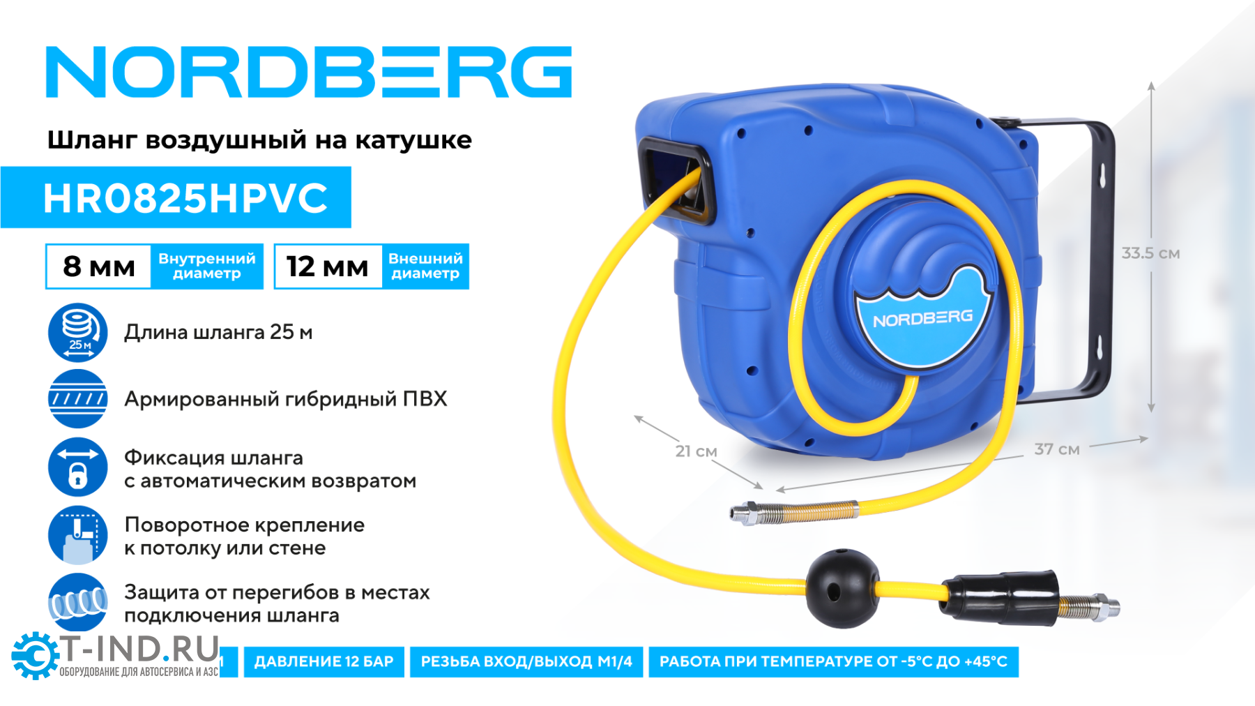 Шланг для раздачи сжатого воздуха ПВХ NORDBERG HR0825HPVC, 8х12мм, на катушке, 25+1м