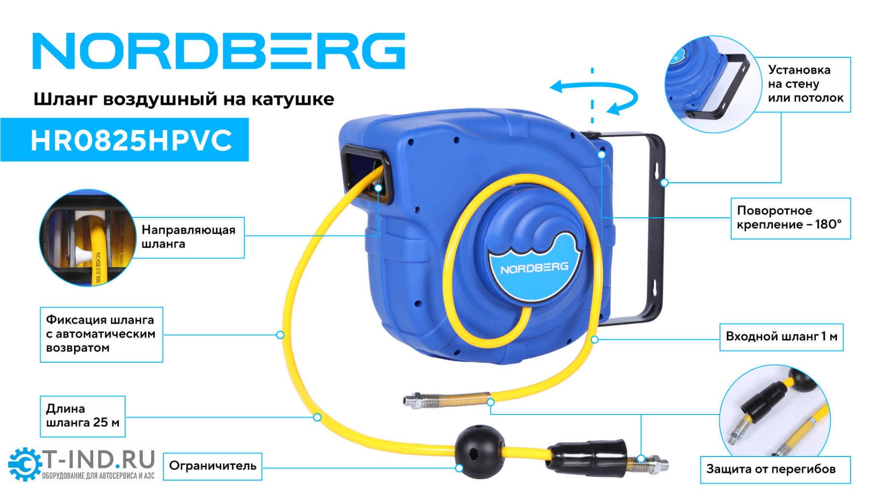 NORDBERG HR0825HPVC — воздушный шланг на катушке из ПВХ. Предназначен для подачи сжатого воздуха от пневмолинии к пневмоинструменту на станциях технического обслуживания и производственных предприятиях.