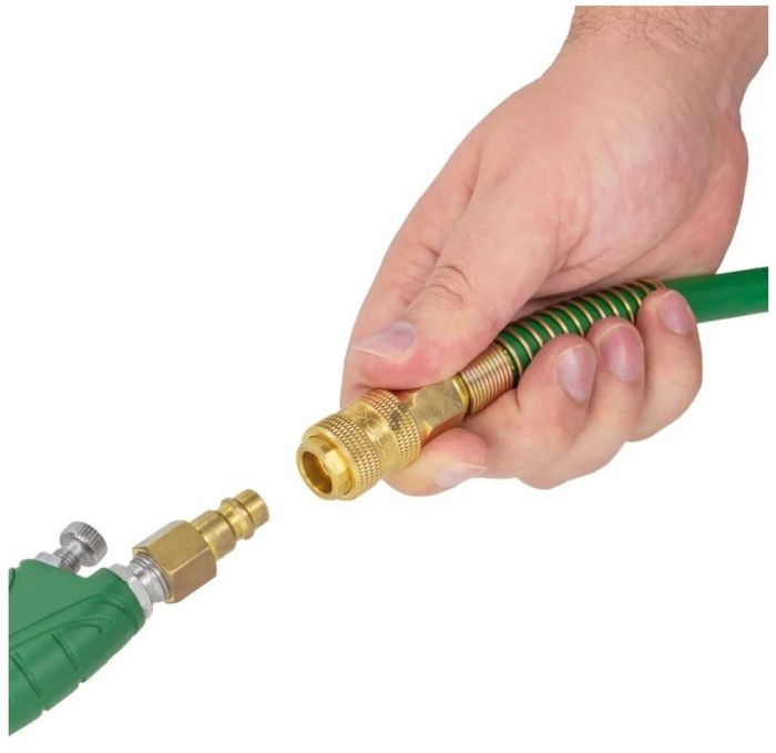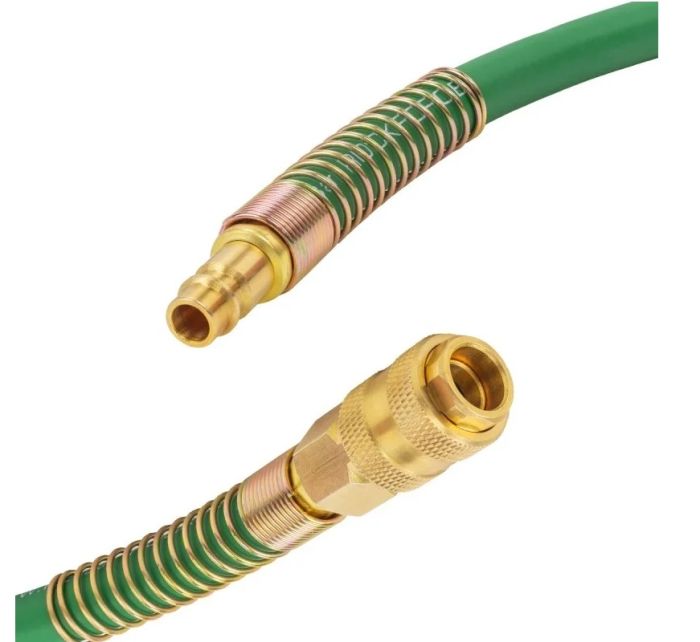 Пневмошланг высокого давления оснащен дополнительной защитой в виде стальных пружин, которые предотвращают изламывание шланга в местах крепления, внутренний диаметр 8 мм и внешний диаметр 14 мм.
