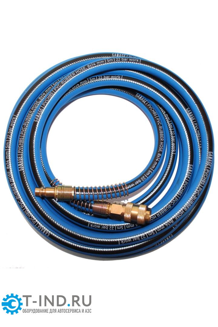 Шланг ПВХ армированный 8/14 мм, 10 м Garage оснащен быстросъемными соединителями и применяется для соединения пневматического инструмента с компрессорами и линиями подачи сжатого воздуха.Изготовлен из ПВХ и резины(тем самым повышается прочность и мягкость шланга) с латунными переходниками.Рабочее давление 22бар. Максимальное давление 65бар.