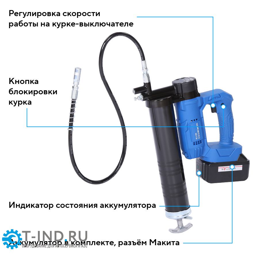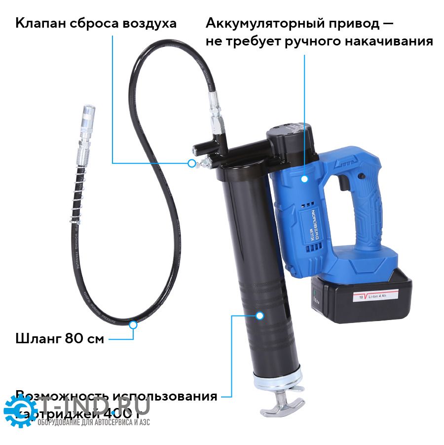 - Аккумуляторный привод — не требует ручного накачивания, обеспечивает стабильную подачу смазки;