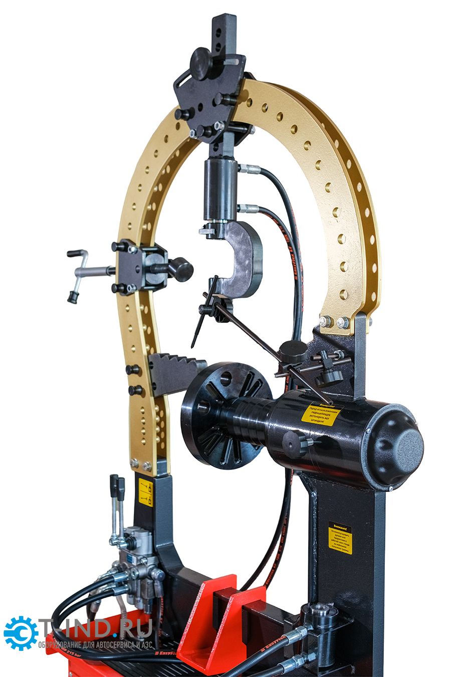 Обновленный стенд получил специальную конструкцию – мост с навесным оборудованием, устанавливаемый на место классических упоров. При этом на мост устанавливаются свои, специальные упоры, полностью замещающие старые и расширяющие возможности ремонта колесных дисков. Также на мост установлен винтовой упор, необходимый для правки сложных повреждений и повреждений типа «восьмерка», и специальный двухсторонний гидроцилиндр с захватом. Конструкция гидроцилиндра позволяет фиксировать его в любом положении и производить правку диска одной рукой, без удержания гидроцилиндра на весу.