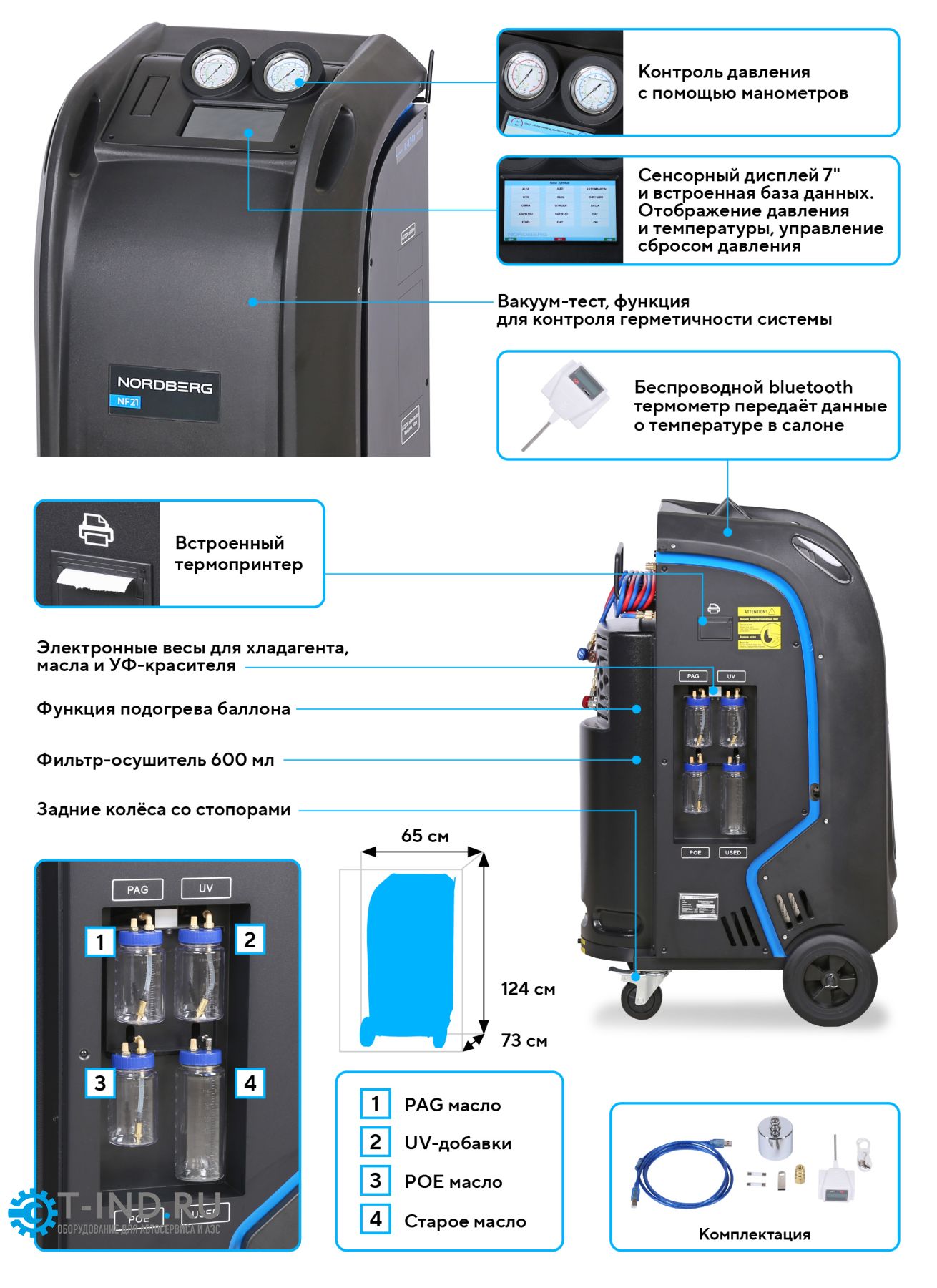 NORDBERG NF21 — автоматическая установка для заправки и диагностики автомобильных кондиционеров. Установка предназначена для заправки и диагностики автомобильных кондиционеров и рефрижераторных установок с использованием хладагента.