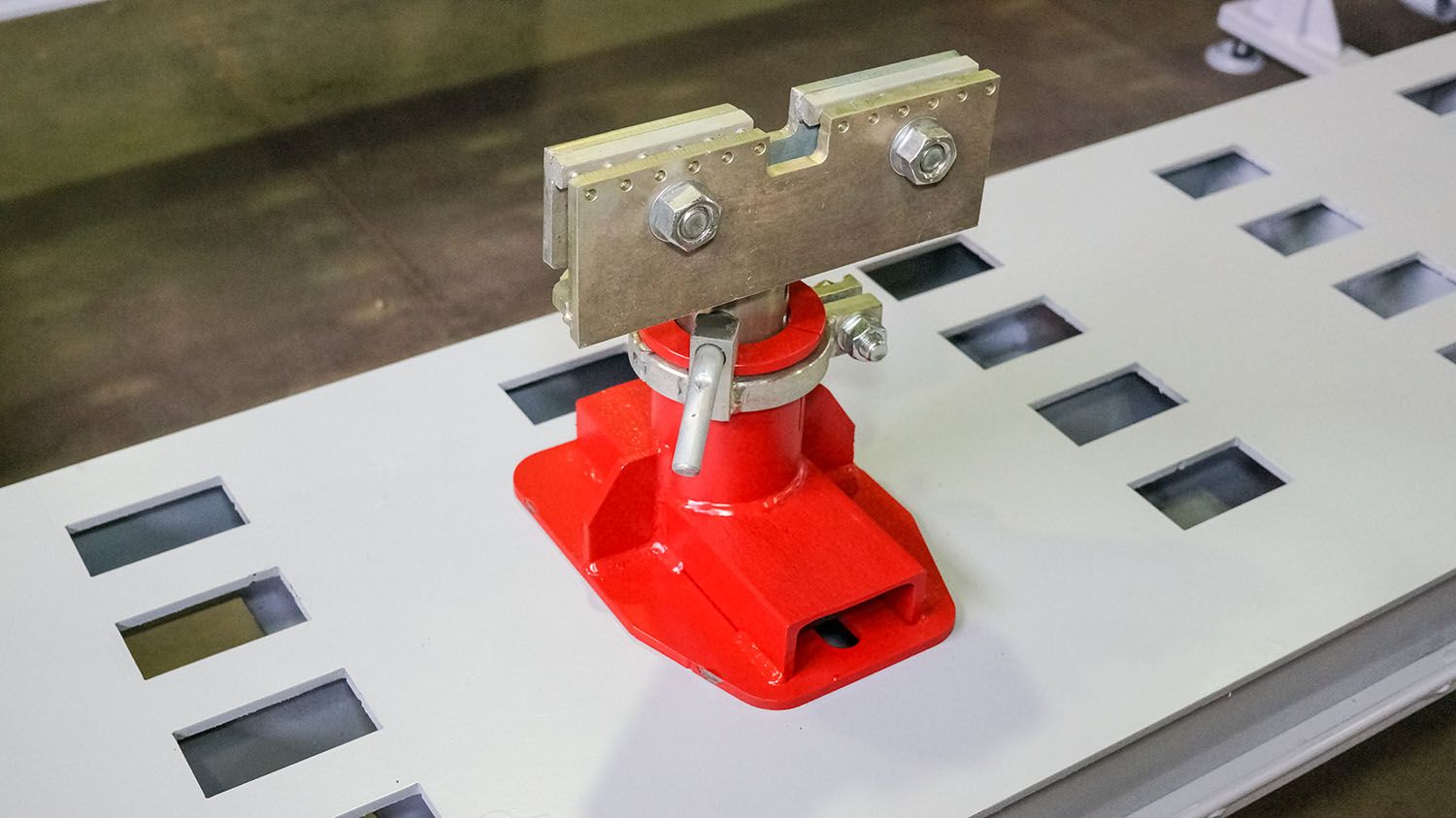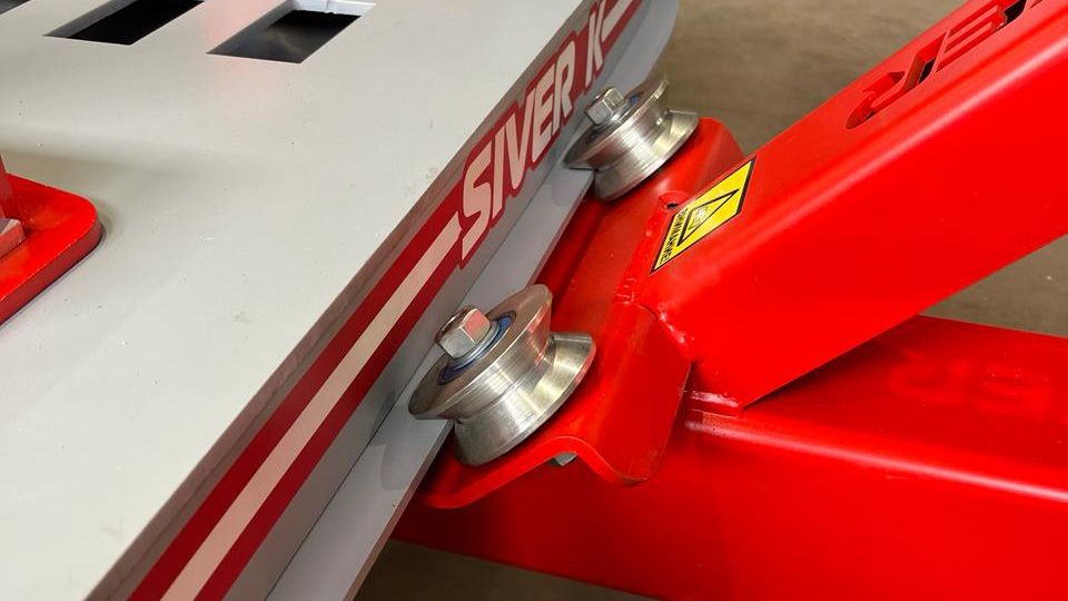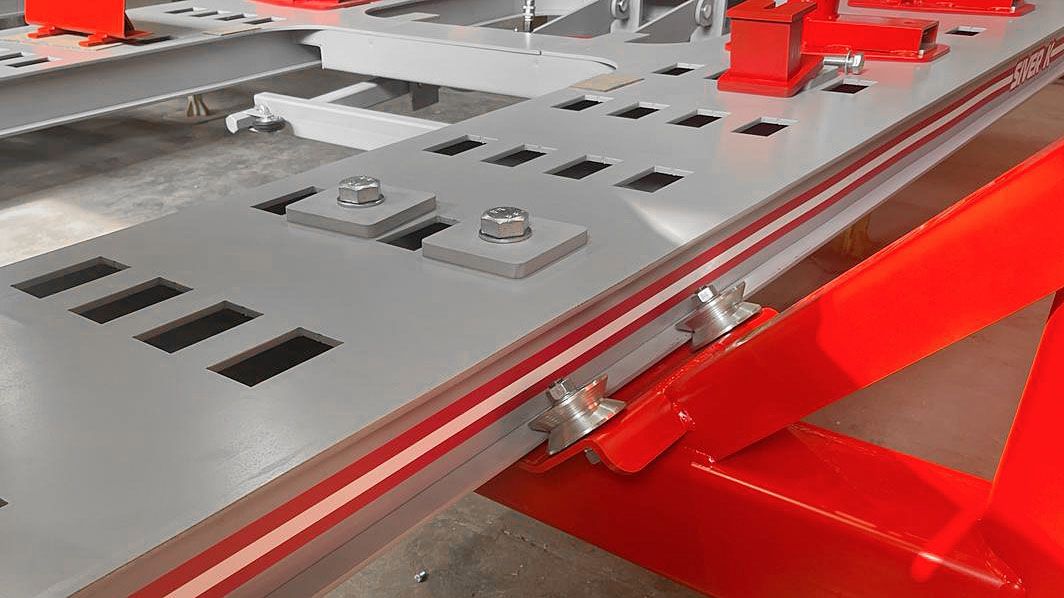 - Силовая башня оборудована мощной и надежной гидравликой, управляемой пневмогидравлической педалью и оснащена роликами. Расположена непосредственно на платформе. Башня без лишних усилий передвигается вдоль периметра стенда по рельсовым направляющим и фиксируется в любой точке, в том числе на углах стапеля.