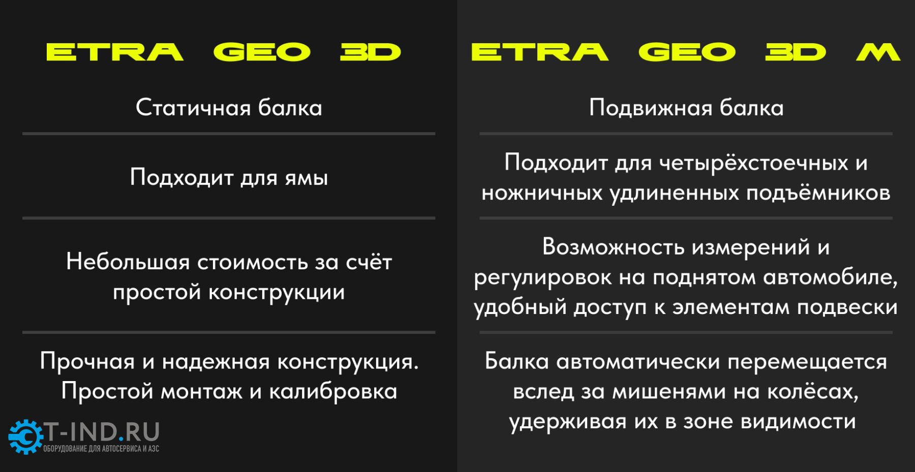 ETRA GEO 3D M – это современный стенд для настройки развала-схождения, использующий надежные и высокоточные 3D технологии. Его конструкция включает подвижную T-образную стойку с двумя камерами, которые фиксируются на специальных мишенях. Подвижная стойка повышает удобство работы с подъемниками и снижает вероятность ошибок, связанных с неравномерным перемещением опоры.