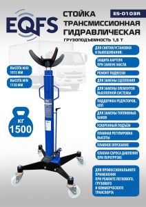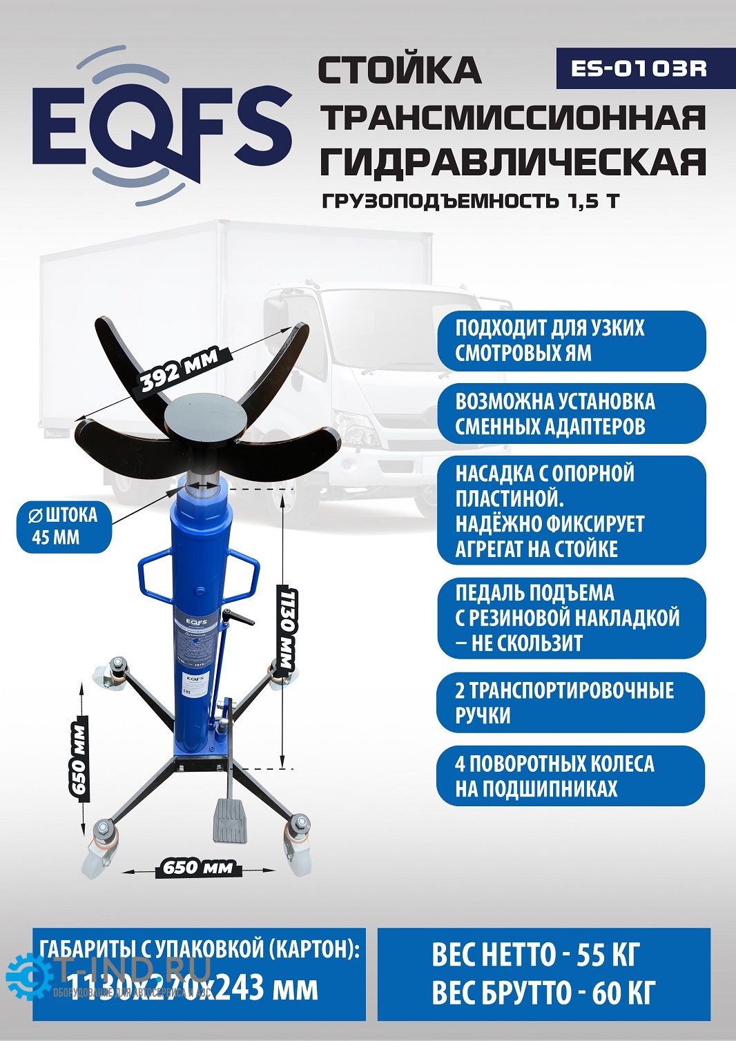 Стойка трансмиссионная гидравлическая 1,5т EQFS ES-0103R. Профессиональная серия. Не текут и не ломаются. Для грузового и коммерческого транспорта. Цилиндр с клапанным блоком и возвратной пружиной. Удобная педаль накачки. Две ручки для перемещения. 4 прочных поворотных колеса. Клапан защиты от перегрузки. Ускоренный подъём. Грузоподъёмность - 1 500 кг. Высота подъёма 1130÷1915мм. Шток Ø45 мм.