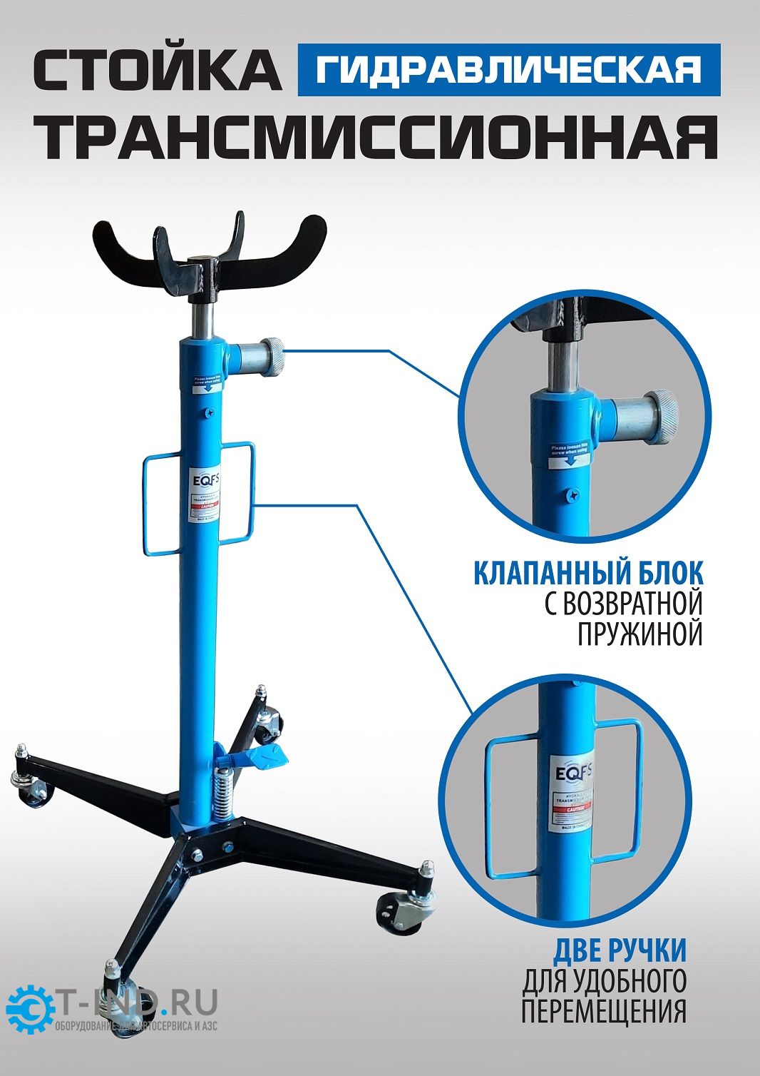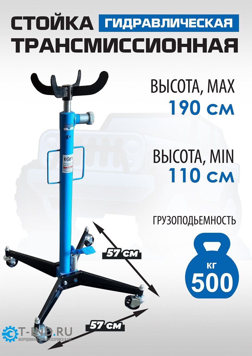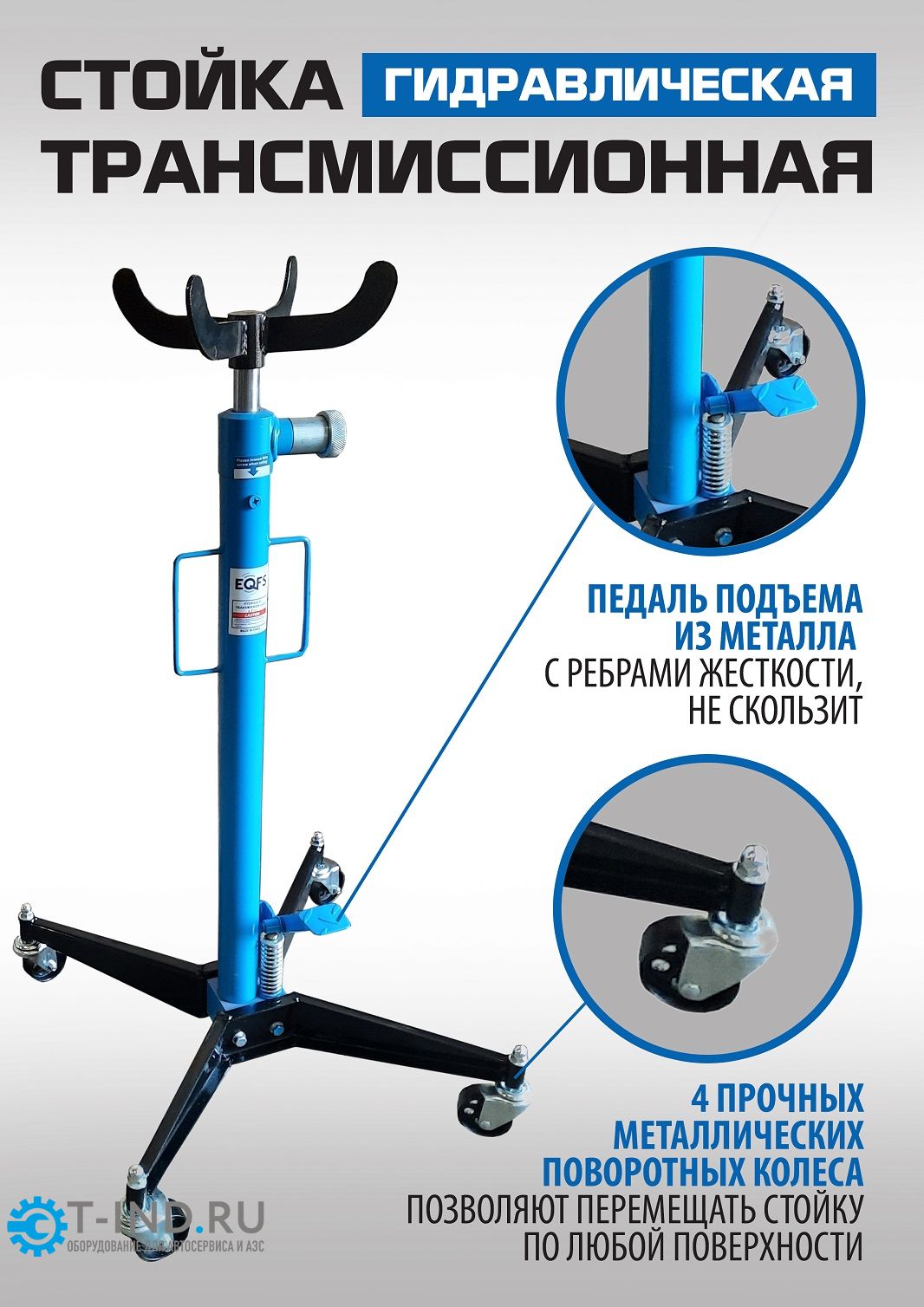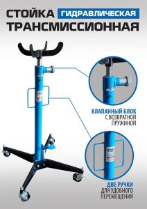 Стойка трансмиссионная гидравлическая EQFS ES0102 профессиональная грузоподъемность 500кг используется при монтаже и демонтаже узлов трансмиссий, КПП, тормозных суппортов и других агрегатов автомобиля, установленного на смотровой яме, эстакаде или подъемнике для ремонта или технического обслуживания. Трансмиссионная гидравлическая стойка является мобильным подъемным устройством. С ее помощью можно поднять и переместить снятый узел. Цвет темно-синий.
