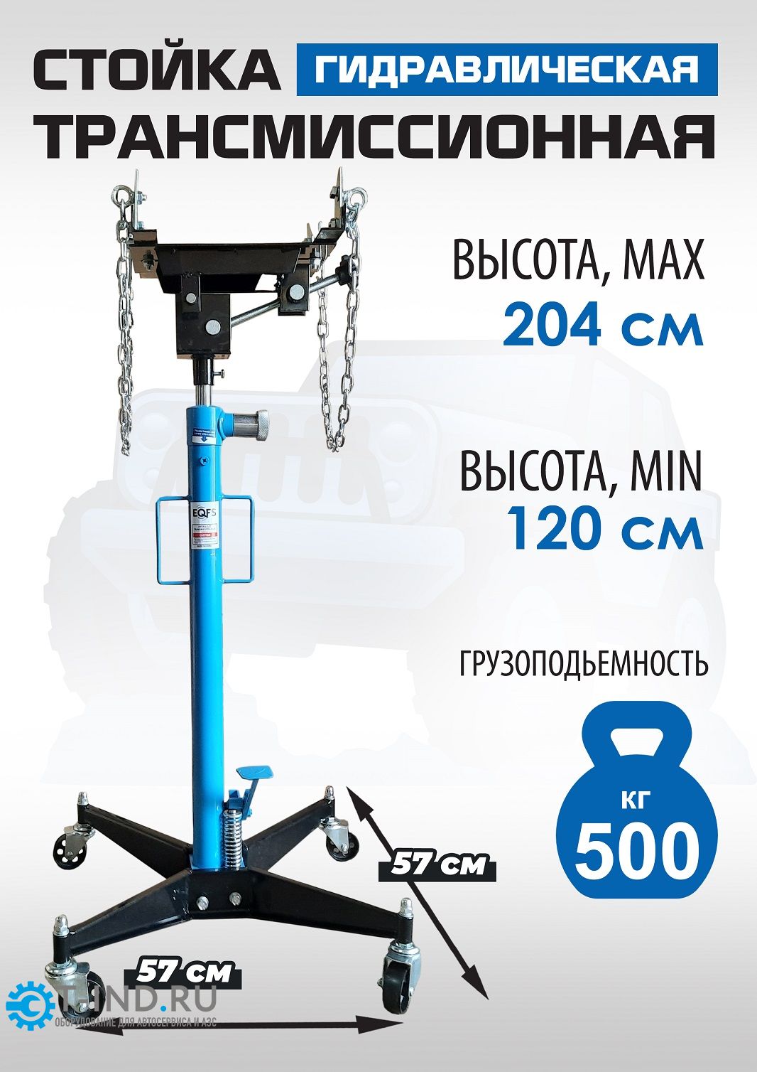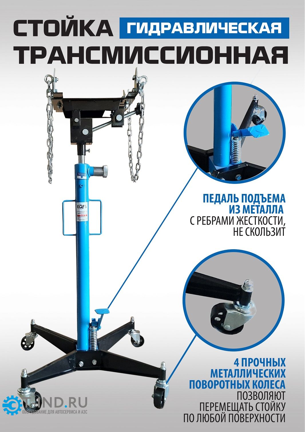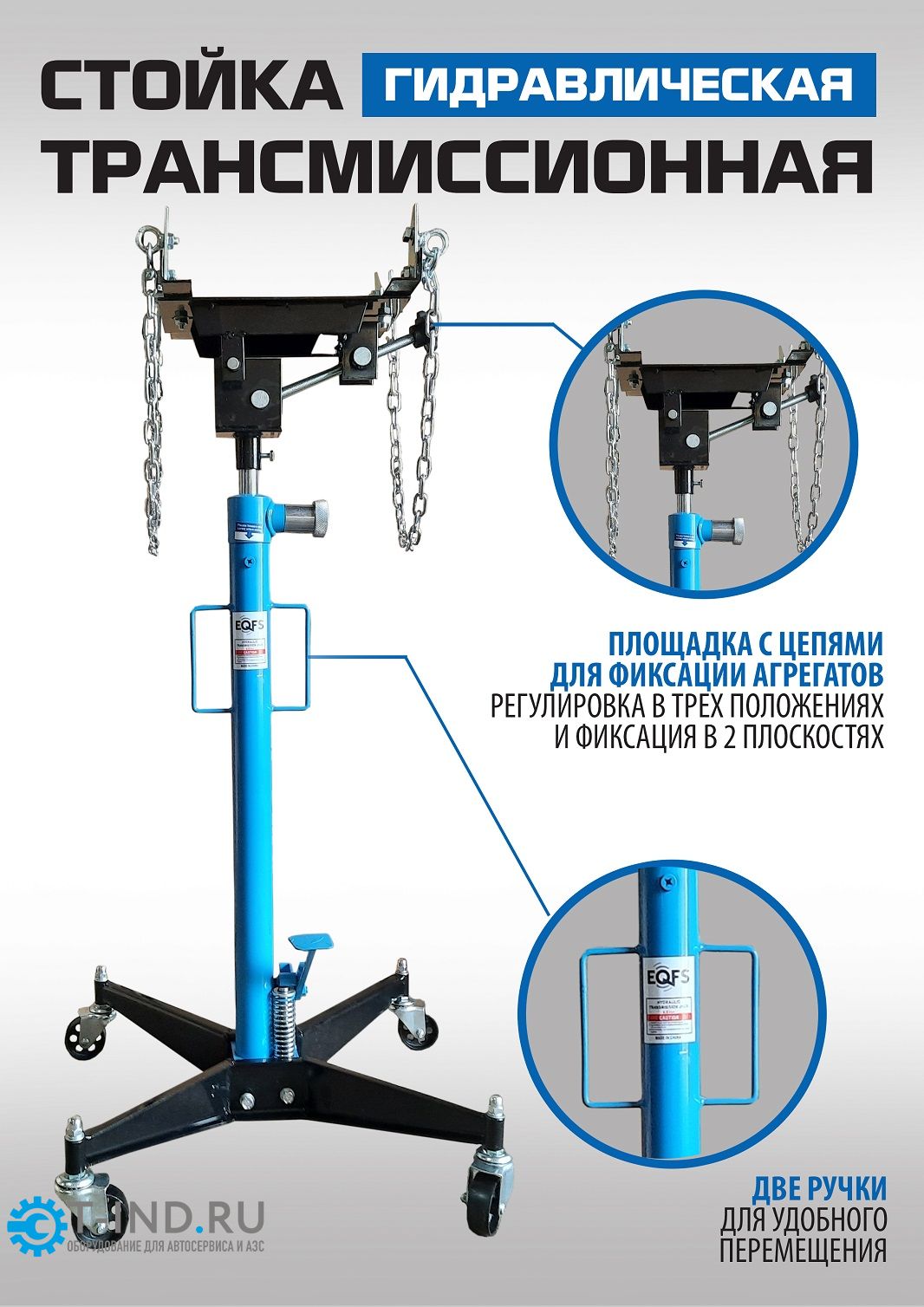 Стойка трансмиссионная гидравлическая профессиональная EQFS ES0102B. Применяется при монтаже и демонтаже узлов трансмиссий, тормозных суппортов и других агрегатов автомобиля, или технического обслуживания. Стойка трансмиссионная гидравлическая является мобильным подъемным механизмом. Цвет темно-синий. Оборудована страховочной цепью, для предотвращения падения агрегата. Регулировка с фиксацией в трех плоскостях: продольно, по наклону, по оси вращения.