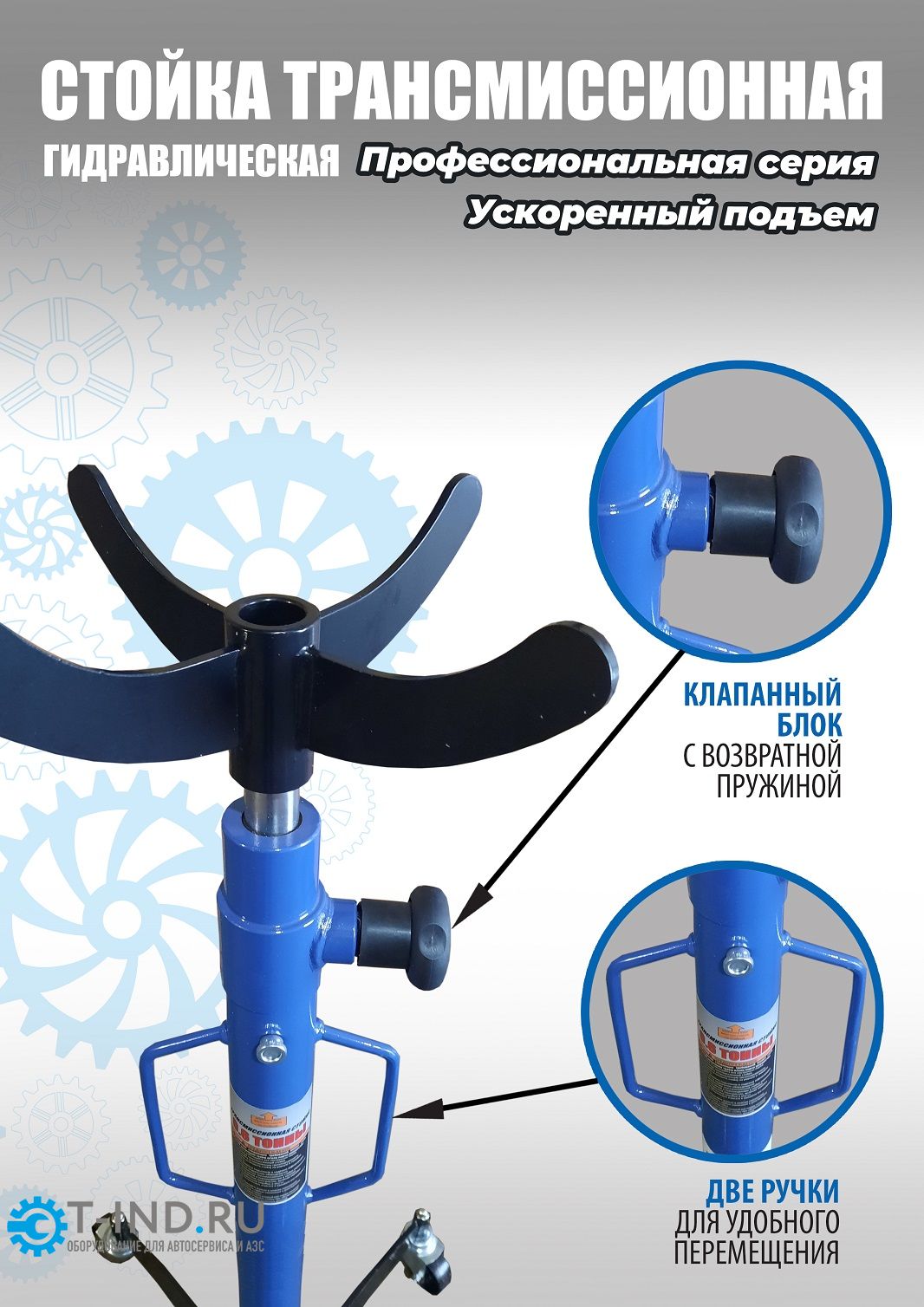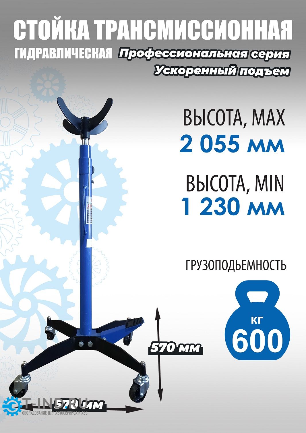 Стойка трансмиссионная Техносоюз TS0905 гидравлическая профессиональная грузоподъемность 600кг используется при монтаже и демонтаже узлов трансмиссий, КПП, тормозных суппортов и других агрегатов автомобиля, установленного на смотровой яме, эстакаде или подъемнике для ремонта или технического обслуживания. Трансмиссионная гидравлическая стойка является мобильным подъемным устройством. С ее помощью можно поднять и переместить снятый узел. Профессиональная серия. Не текут и не ломаются. Ускоренный подъём. Мощная педаль. Хромированный шток. Две ручки для перемещения. 4 поворотных колеса с подшипниками обеспечивают легкость перемещения. диаметр штока 30 мм. Подъём 1230-2055 мм. г/п 600 кг. Применяется при монтаже и демонтаже узлов трансмиссий, тормозных суппортов и других агрегатов автомобиля, или технического обслуживания.Стойка трансмиссионная гидравлическая является мобильным подъемным механизмом.